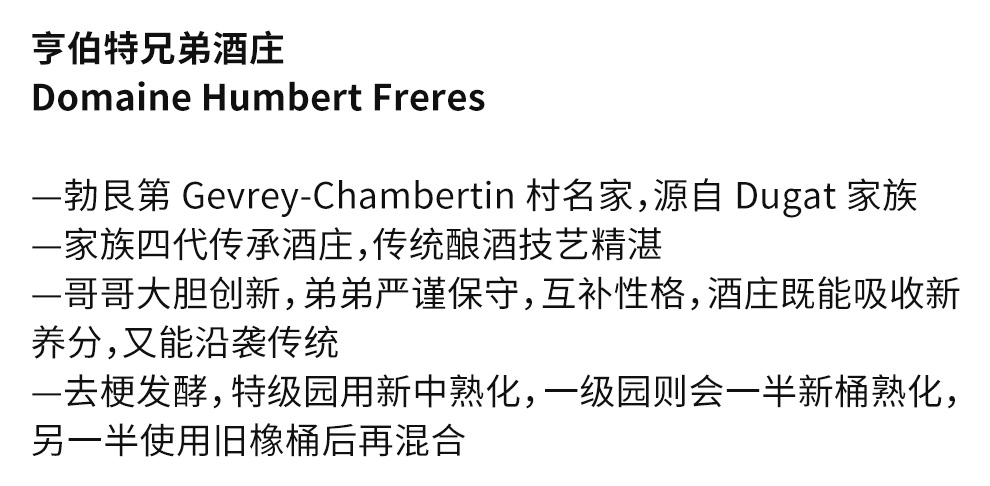 亨伯特兄弟酒庄在哲伏-香贝丹产区一共有4个一级园和1个特级园。这些葡萄园位于不同的区域,拥有多样的风土特色。