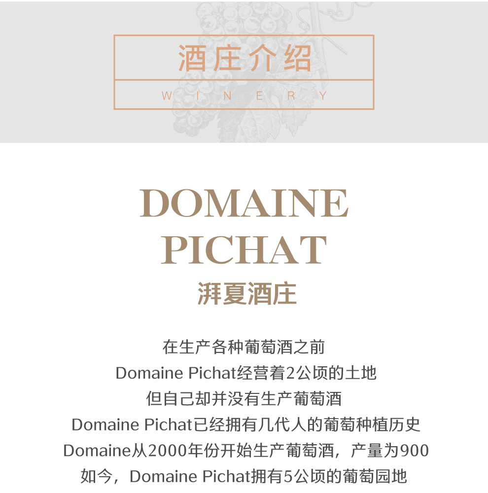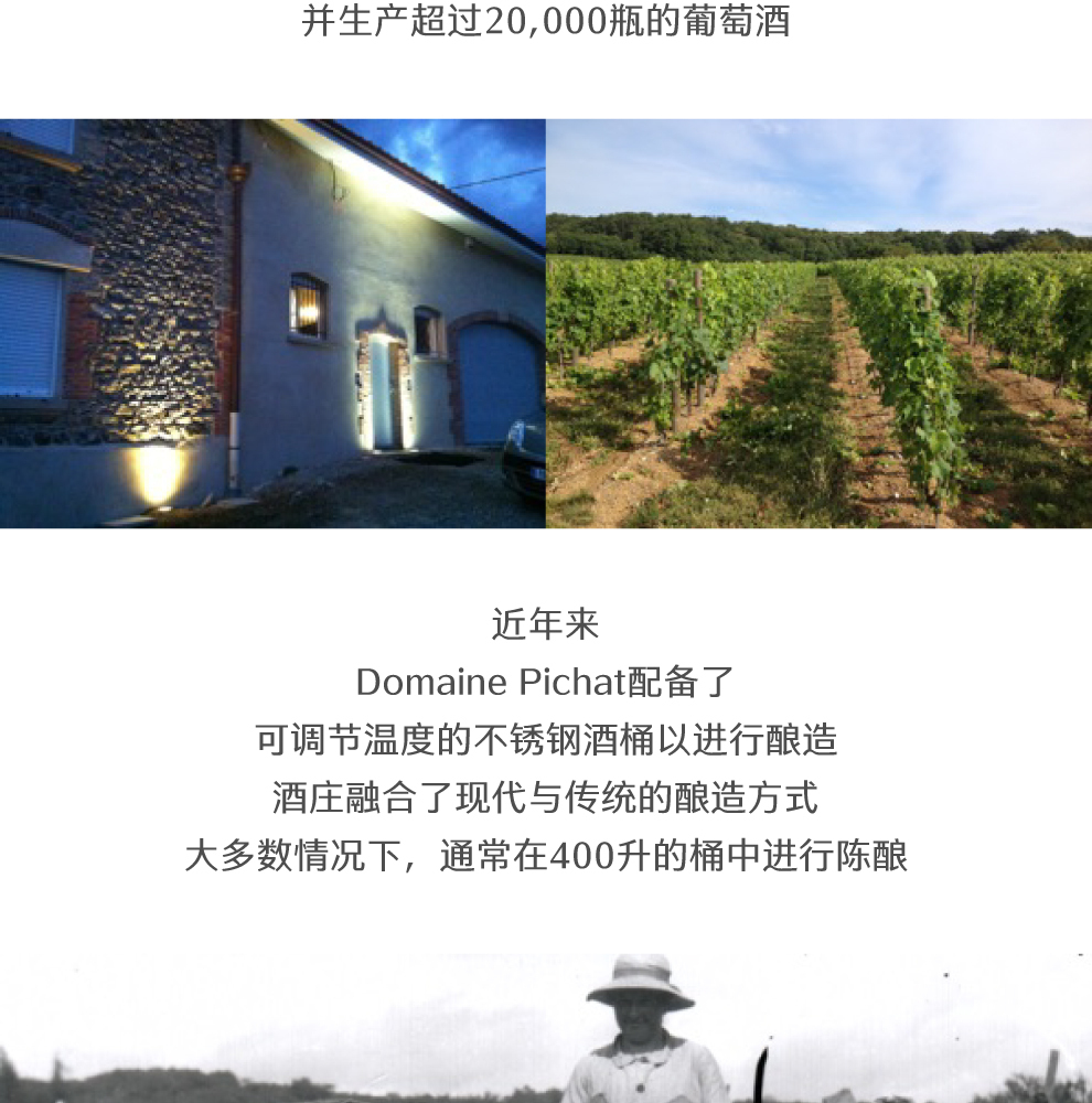 在生产各种葡萄酒之前, Domaine Pichat经营着2公顷的土地,但自己却并没有生产葡萄酒。 Domaine Pichat已经拥有几代人的葡萄种植历史。 Domaine从2000年份开始生产葡萄酒,产量为900瓶。如今,Domaine Pichat拥有5公顷的葡萄园地,并生产超过20,000瓶的葡萄酒。