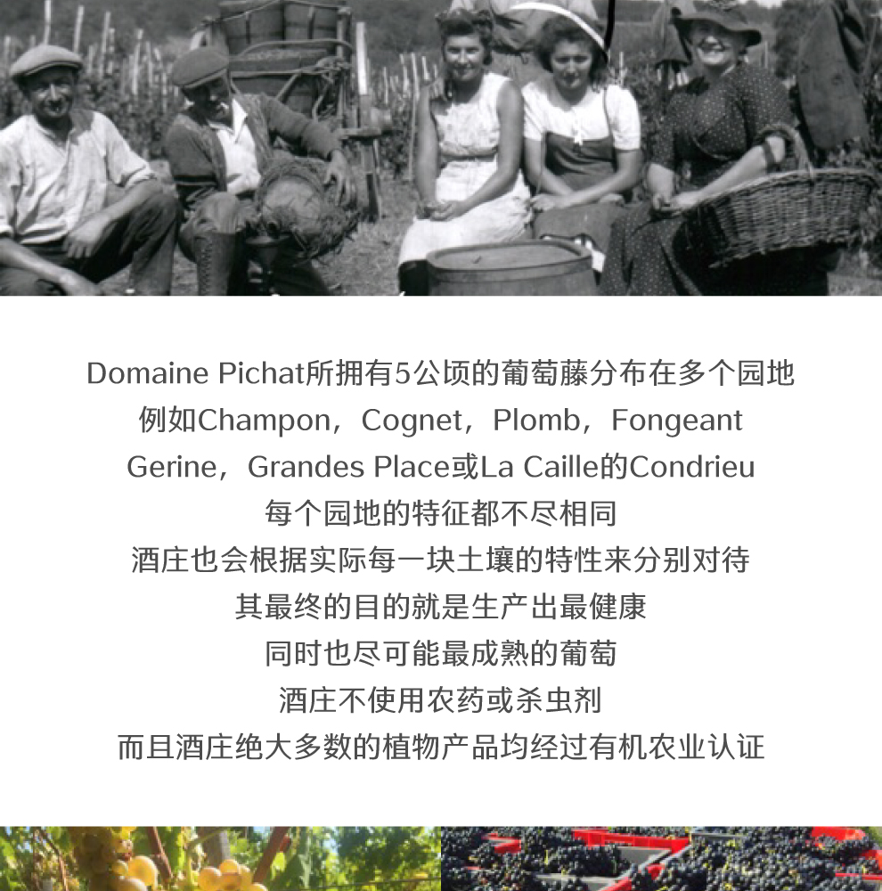 Domaine Pichat所拥有5公顷的葡萄藤分布在多个园地,例如Champon,Cognet,Plomb,Fongeant,Gerine,Grandes Place或La Caille的Condrieu。每个园地的特征都不尽相同,酒庄也会根据实际每一块土壤的特性来分别对待。其最终的目的就是生产出最健康,同时也尽可能最成熟的葡萄。酒庄不使用农药或杀虫剂,而且酒庄绝大多数的植物产品均经过有机农业认证。