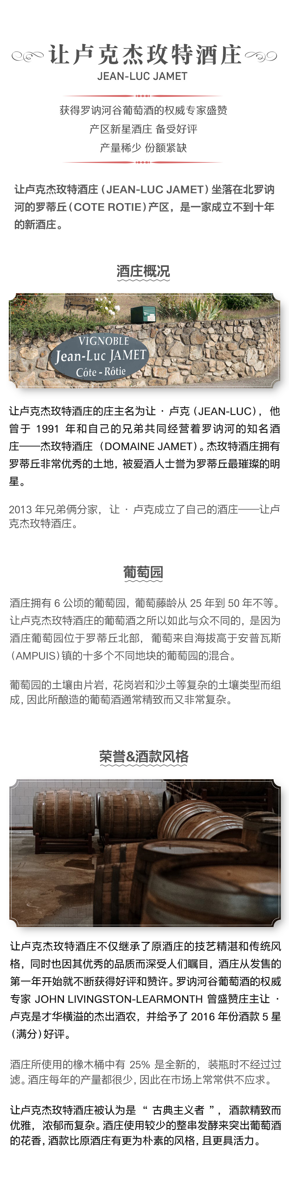 让卢克杰玫特酒庄(JEAN-LUC JAMET)坐落在北罗讷河的罗蒂丘(Cote Rotie)产区,是一家成立不到十年的新酒庄。