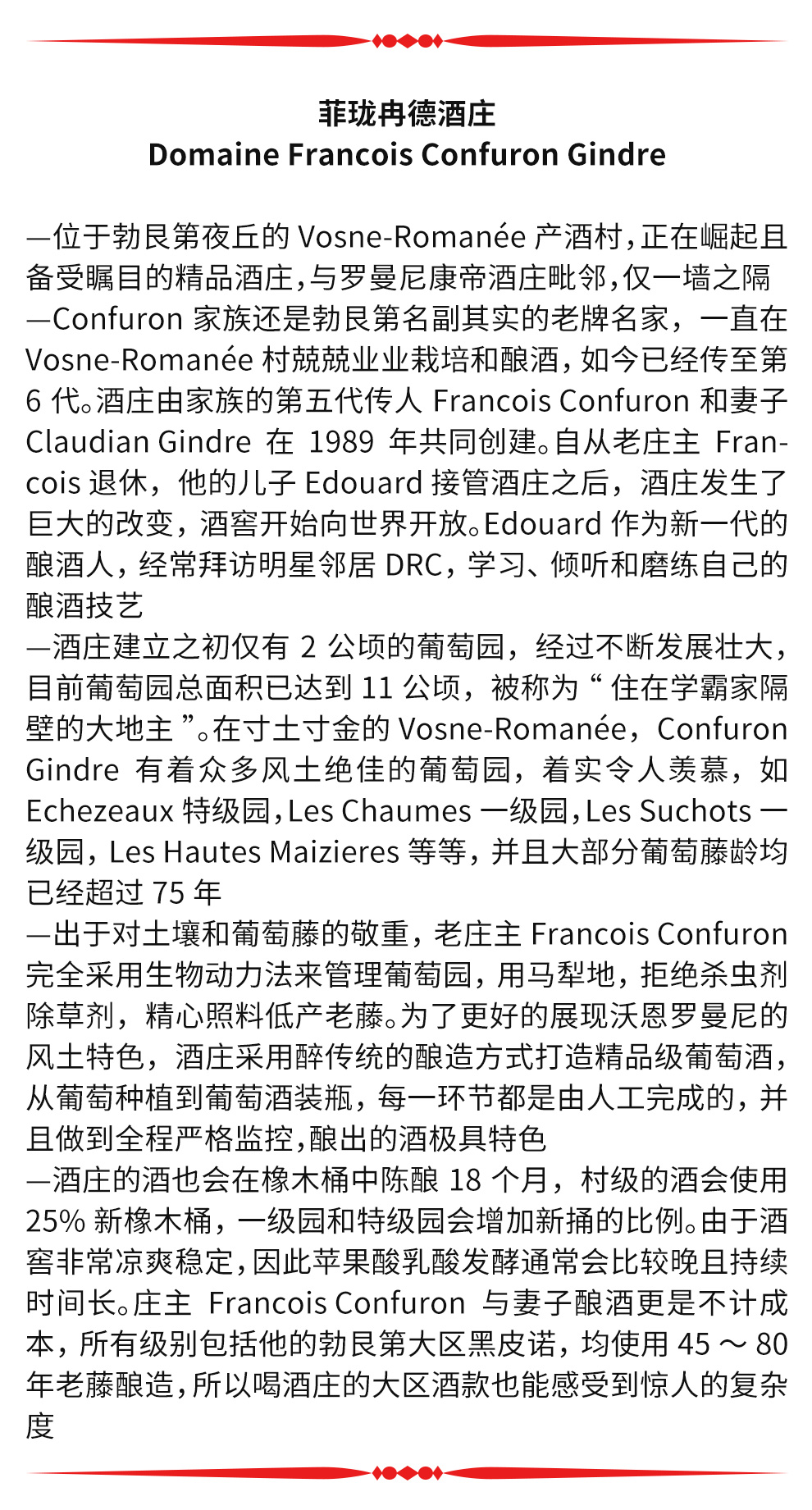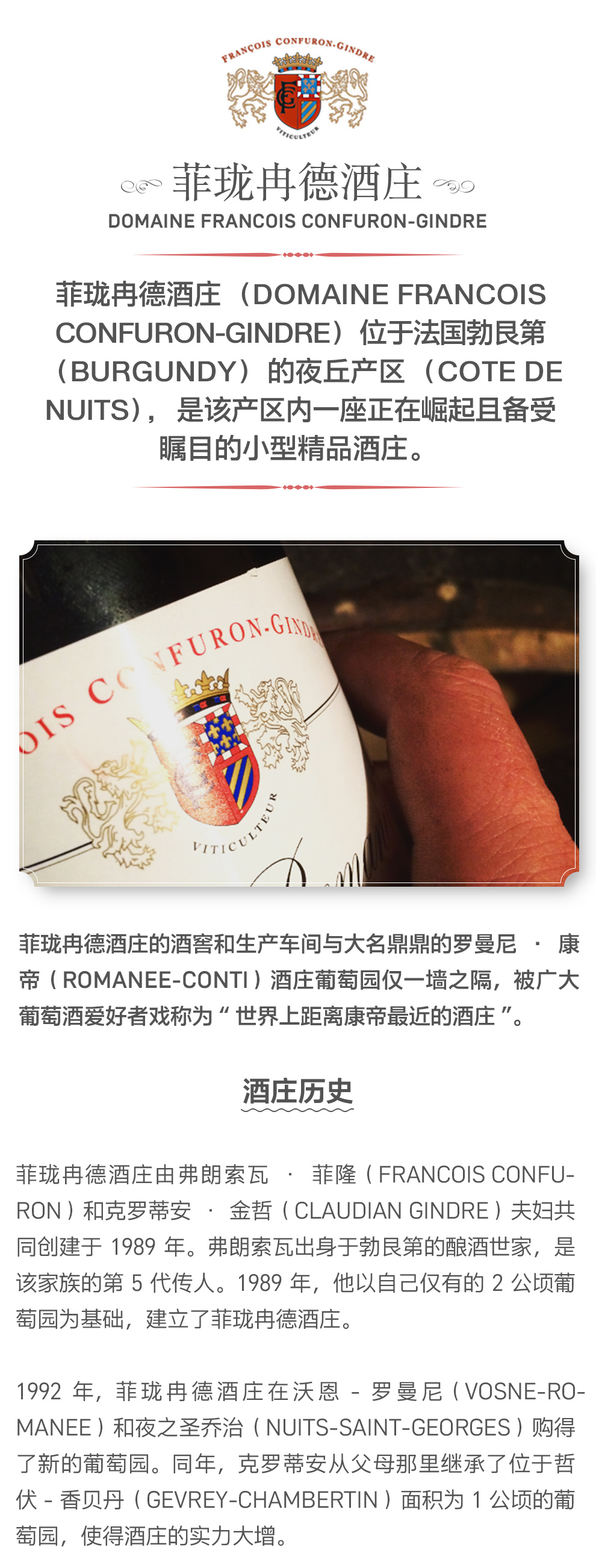菲珑冉德酒庄(Domaine Francois Confuron-Gindre)位于法国勃艮第(Burgundy)的夜丘产区(Cote de Nuits),是该产区内一座正在崛起且备受瞩目的小型精品酒庄。