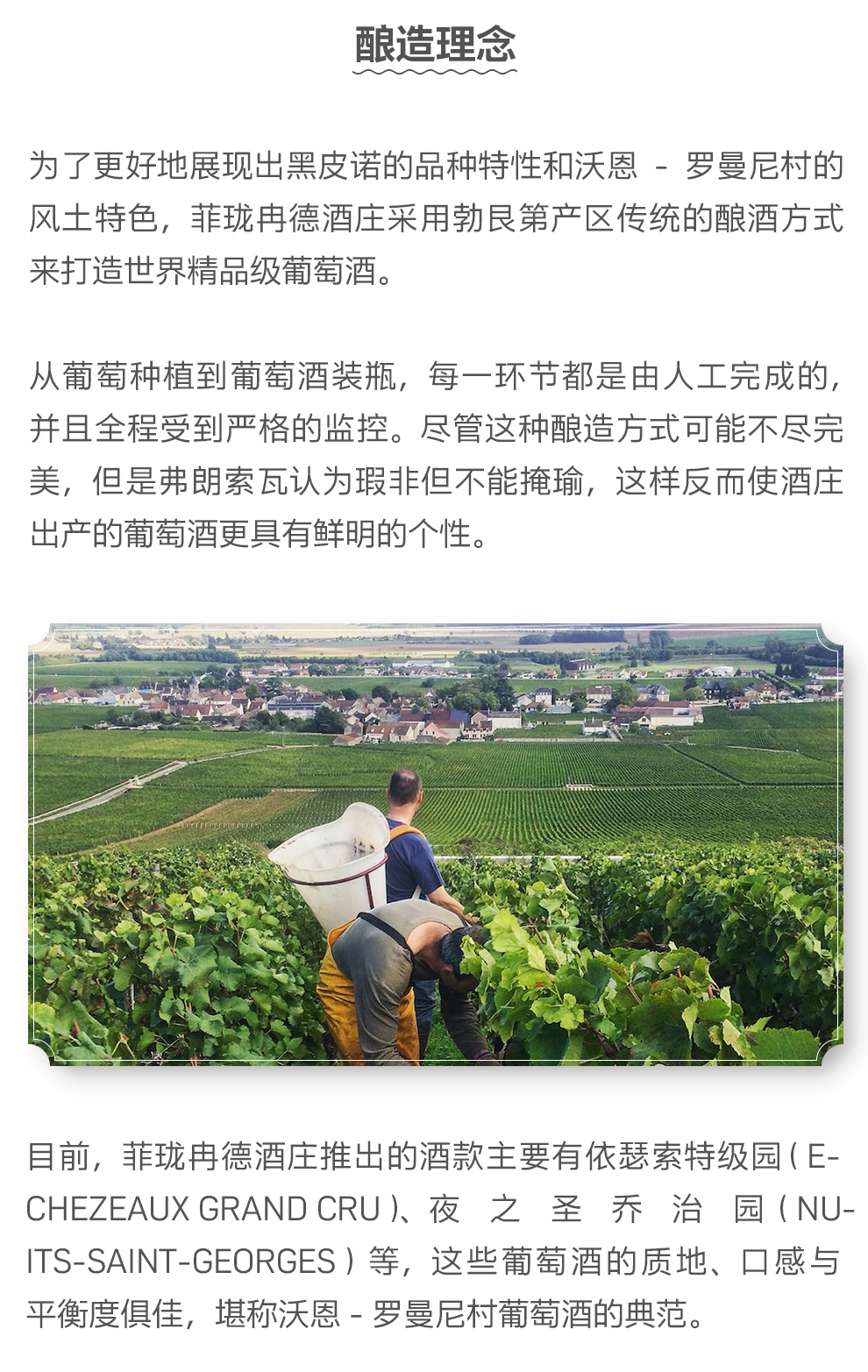 为了更好地展现出黑皮诺的品种特性和沃恩-罗曼尼村的风土特色,菲珑冉德酒庄采用勃艮第产区传统的酿酒方式来打造世界精品级葡萄酒。