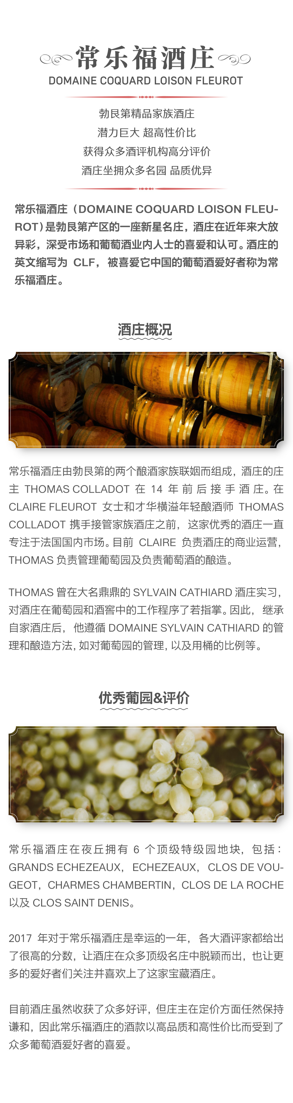 常乐福酒庄(DOMAINE COQUARD LOISON FLEUROT)是勃艮第产区的一座新星名庄,酒庄在近年来大放异彩,深受市场和葡萄酒业内人士的喜爱和认可。酒庄的英文缩写为CLF,被喜爱它中国的葡萄酒爱好者称为常乐福酒庄。
