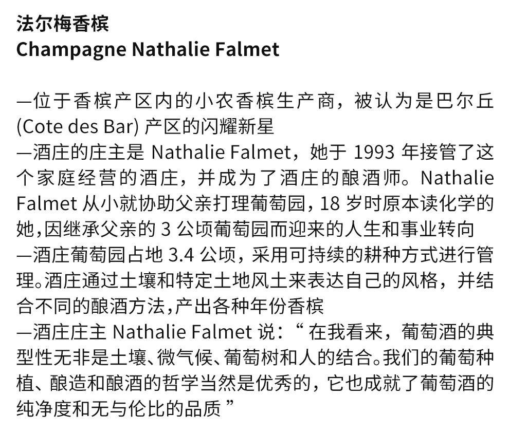 法尔梅香槟酒庄(CHAMPAGNE NATHALIE FALMET)是香槟产区内的一家小农香槟生产商,酒庄被认为是巴尔丘(Cote des Bar)产区的一颗耀眼新星。