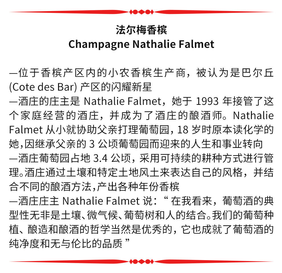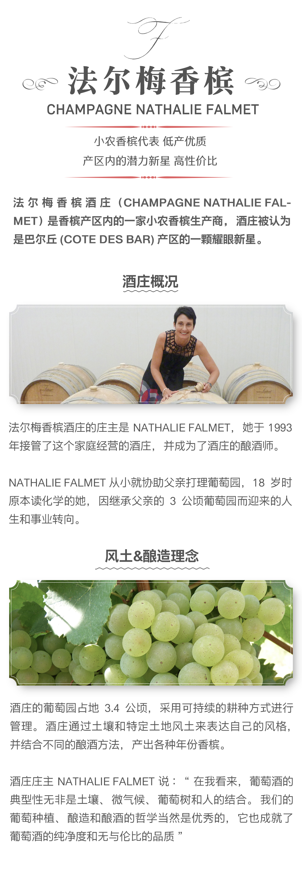 法尔梅香槟酒庄(CHAMPAGNE NATHALIE FALMET)是香槟产区内的一家小农香槟生产商,酒庄被认为是巴尔丘(Cote des Bar)产区的一颗耀眼新星。
