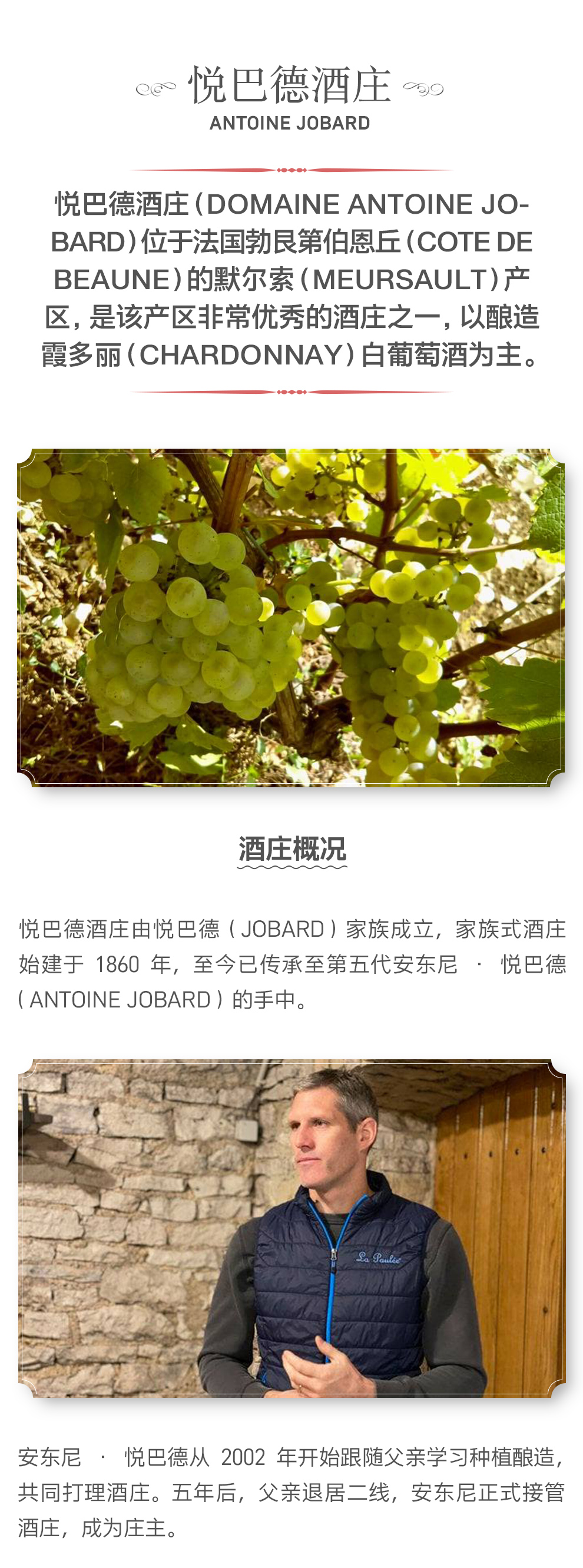 悦巴德酒庄由悦巴德(Jobard)家族成立,家族式酒庄始建于1860年,至今已传承至第五代安东尼·悦巴德(Antoine Jobard)的手中。