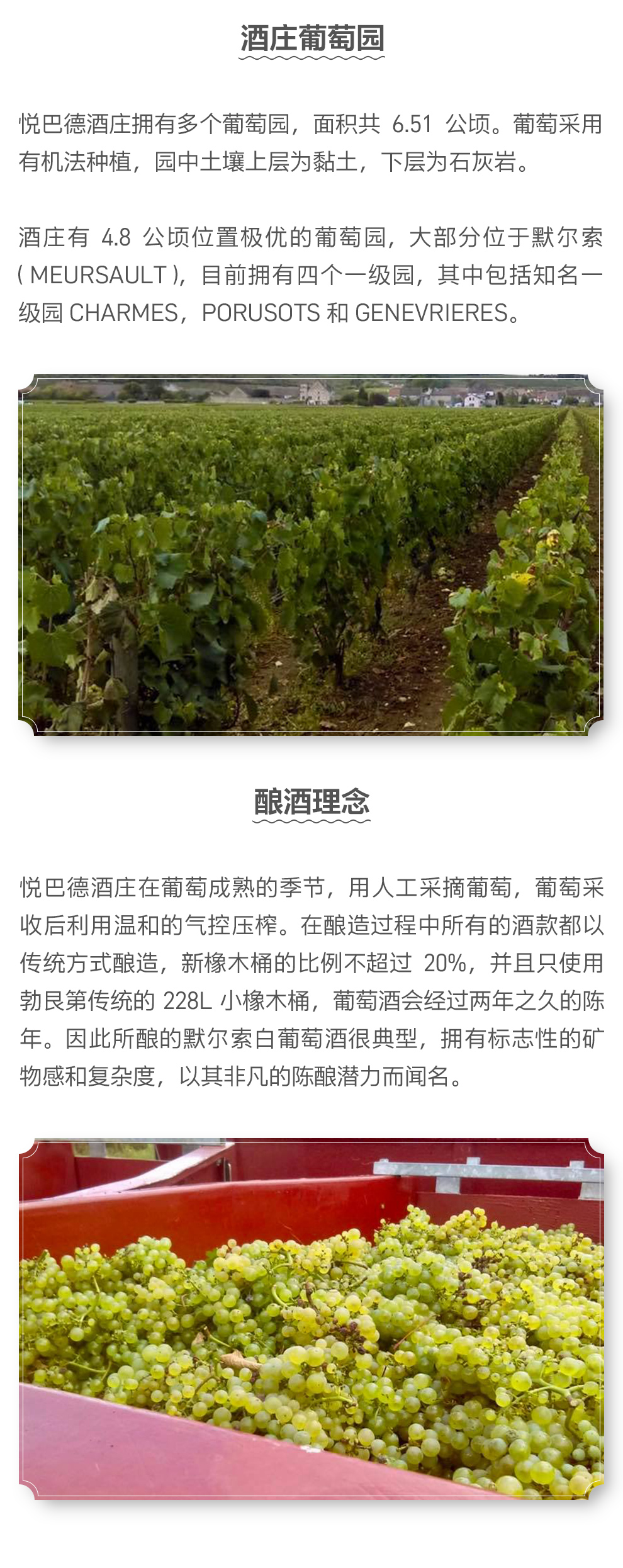 悦巴德酒庄在葡萄成熟的季节,用人工采摘葡萄,葡萄采收后利用温和的气控压榨。在酿造过程中所有的酒款都以传统方式酿造,新橡木桶的比例不超过20%,并且只使用勃艮第传统的228L小橡木桶,葡萄酒会经过两年之久的陈年。因此所酿的默尔索白葡萄酒很典型,拥有标志性的矿物感和复杂度,以其非凡的陈酿潜力而闻名。