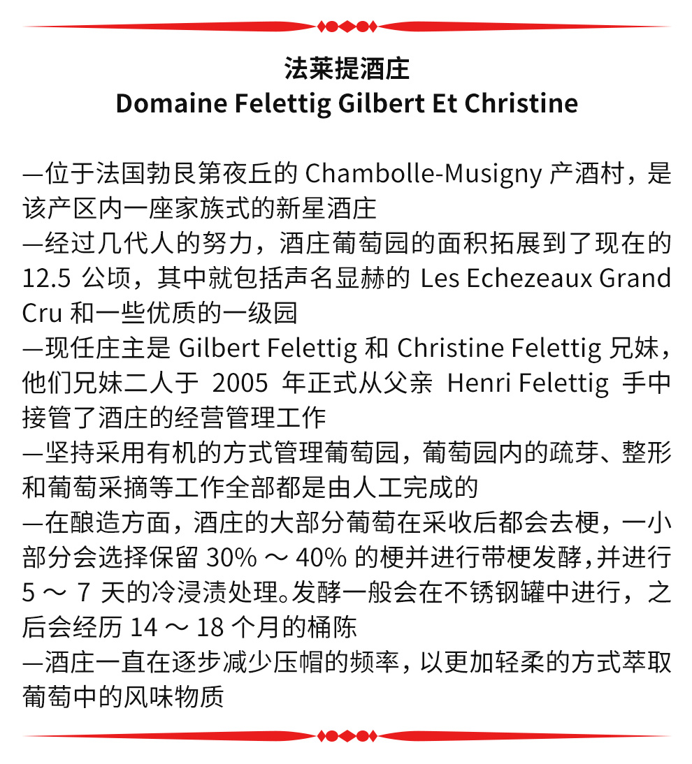法莱提酒庄(Domaine felettig Gilbert et Christine)位于法国勃艮第(Burgundy)夜丘(Cote de Nuits)产区的香波-慕西尼(Chambolle-Musigny)产酒村,是该产区内一座家族式的新星酒庄。