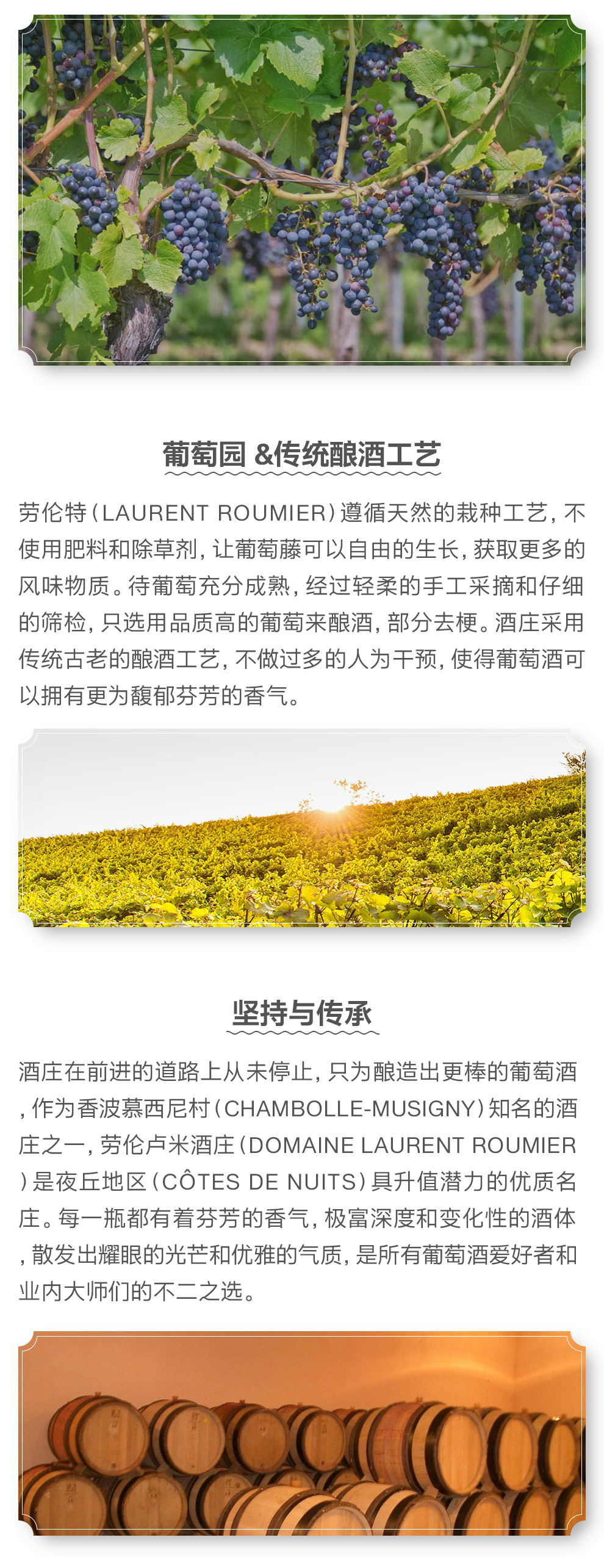 酒庄在前进的道路上从未停止,只为酿造出更棒的葡萄酒,作为香波慕西尼村(Chambolle-Musigny)最知名的酒庄之一,劳伦卢米酒庄(Domaine Laurent Roumier)是夜丘地区(Côtes de Nuits)最具升值潜力的优质名庄。每一瓶都有着芬芳的香气,极富深度和变化性的酒体,散发出耀眼的光芒和优雅的气质,是所有葡萄酒爱好者和业内大师们的不二之选。