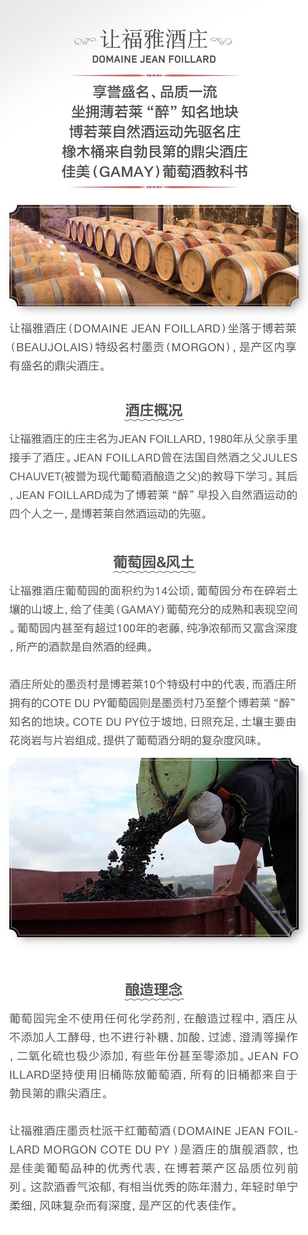 葡萄园完全不使用任何化学药剂,在酿造过程中,酒庄从不添加人工酵母,也不进行补糖、加酸、过滤、澄清等操作,二氧化硫也极少添加,有些年份甚至零添加。Jean Foillard坚持使用旧桶陈放葡萄酒,所有的旧桶都来自于勃艮第的鼎尖酒庄。让福雅酒庄墨贡杜派干红葡萄酒(DOMAINE JEAN FOILLARD MORGON COTE DU PY )是庄的旗舰酒款,也是佳美葡萄品种的优秀代表,在博若莱产区品质位列前列。这款酒香气浓郁,有相当优秀的陈年潜力,年轻时单宁柔细,风味复杂而有深度,是产区的代表佳作。