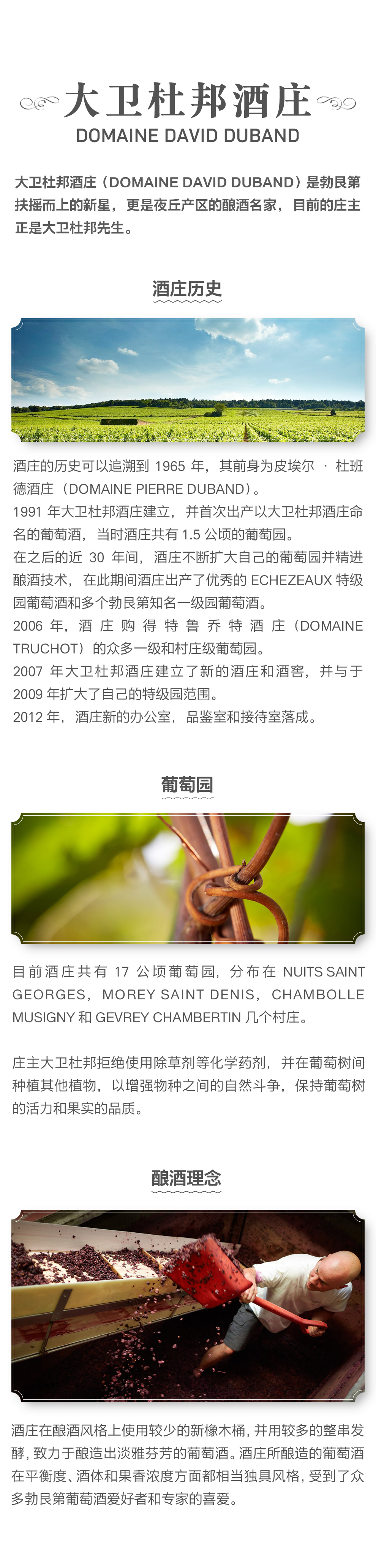 大卫杜邦酒庄(DOMAINE DAVID DUBAND)是勃艮第扶摇而上的新星,更是夜丘产区的酿酒名家,目前的庄主正是大卫杜邦先生。