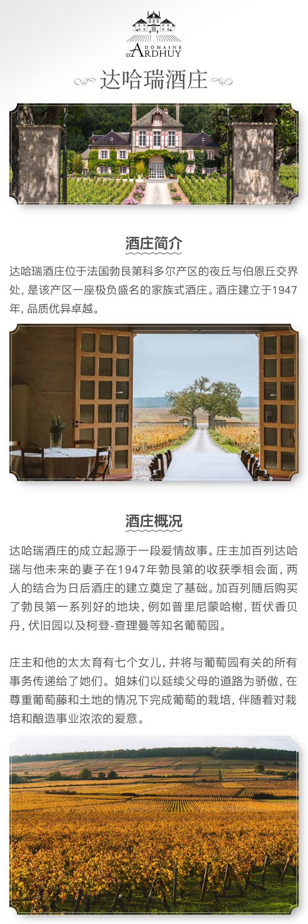达哈瑞酒庄的成立起源于一段爱情故事。庄主加百列达哈瑞(Gabriel d’Ardhuy)与他未来的妻子在1947年勃艮第的收获季相会面,两人的结合为日后酒庄的建立奠定了基础。加百列随后购买了勃艮第一系列好的地块,例如Puligny-Montrachet,Gevrey-Chambertin,Clos de Vougeot以及Corton-Charlemagne等知名葡萄园。庄主和他的太太育有七个女儿,并将与葡萄园有关的所有事务传递给了她们。 姐妹们以延续父母的道路为骄傲,在尊重葡萄藤和土地的情况下完成葡萄的栽培,伴随着对栽培和酿造事业浓浓的爱意。
