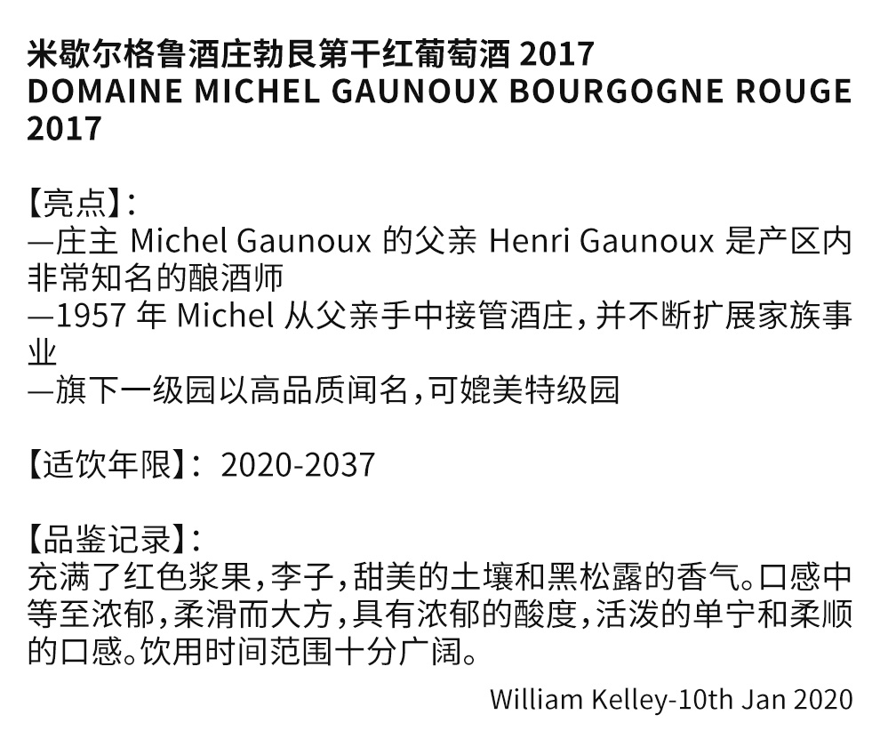 米歇尔格鲁酒庄是一个在勃艮第植根了数个世纪的知名酒庄。当年米歇尔格鲁从父亲手中接管这个家族酒庄,并一跃成为当时极具天赋的酿酒师。1984年,米歇尔格鲁去世后,他的妻子帮助打理酒庄事务,并决定将酒庄命名为“米歇尔格鲁”。如今酒庄由米歇尔的儿子亚历山大格鲁(Alexandre Gaunoux)和母亲共同经营。