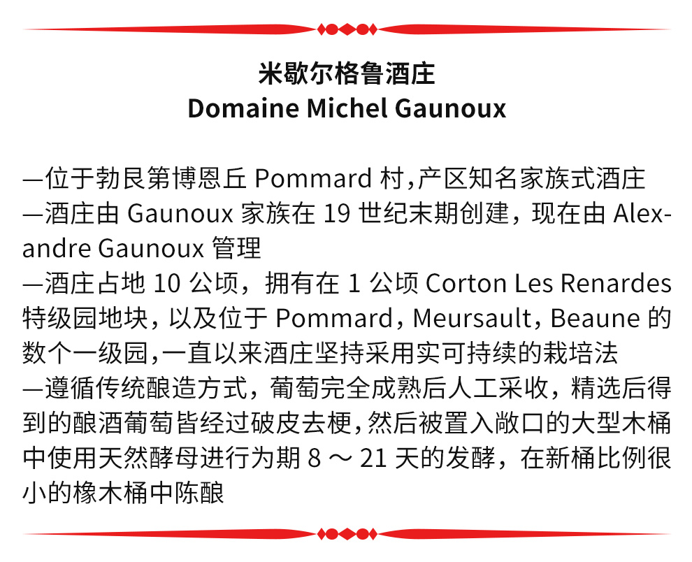 米歇尔格鲁酒庄是一个在勃艮第植根了数个世纪的知名酒庄。当年米歇尔格鲁从父亲手中接管这个家族酒庄,并一跃成为当时极具天赋的酿酒师。1984年,米歇尔格鲁去世后,他的妻子帮助打理酒庄事务,并决定将酒庄命名为“米歇尔格鲁”。如今酒庄由米歇尔的儿子亚历山大格鲁(Alexandre Gaunoux)和母亲共同经营。