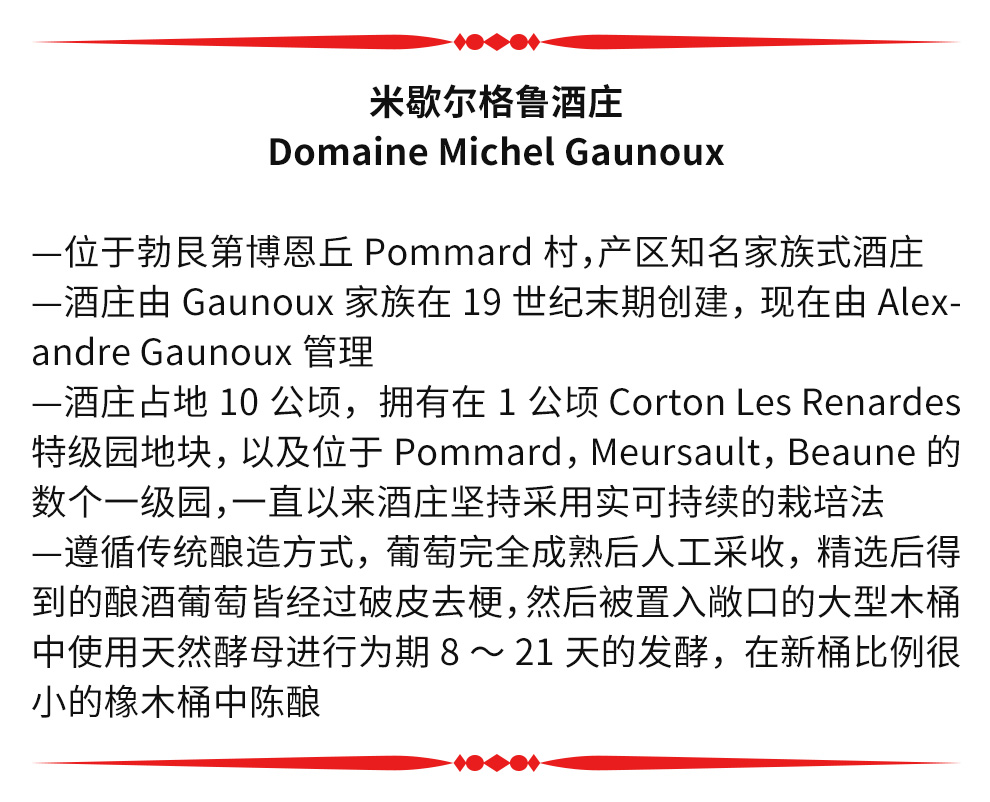 米歇尔格鲁酒庄是一个在勃艮第植根了数个世纪的知名酒庄。当年米歇尔格鲁从父亲手中接管这个家族酒庄,并一跃成为当时极具天赋的酿酒师。1984年,米歇尔格鲁去世后,他的妻子帮助打理酒庄事务,并决定将酒庄命名为“米歇尔格鲁”。如今酒庄由米歇尔的儿子亚历山大格鲁(Alexandre Gaunoux)和母亲共同经营。