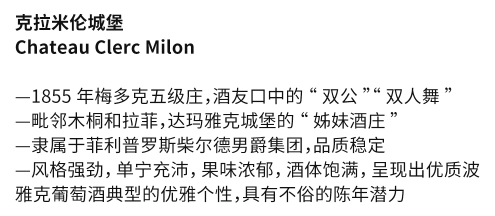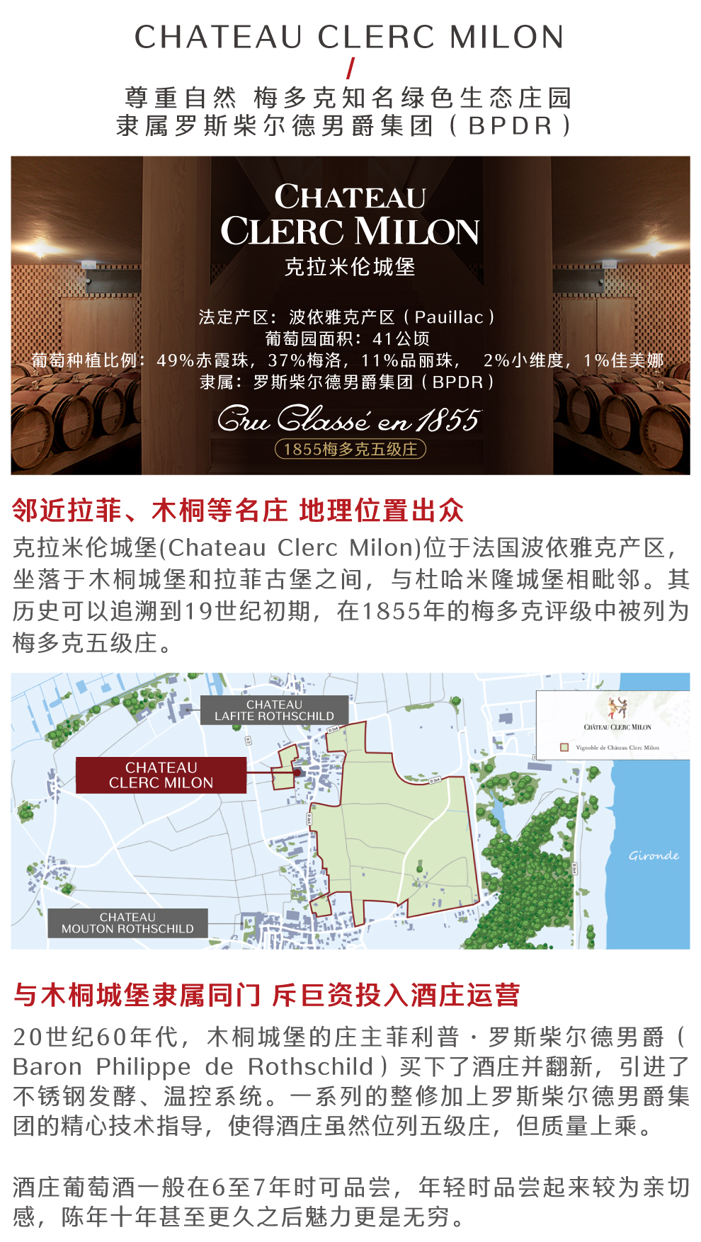克拉米伦庄园坐落在波依亚克产区,位于木桐庄园和拉菲庄园之间,与杜哈米伦庄园相毗邻。酒庄名字中的Milon,是Pauillac产区内的村庄名,而clerc则是1855年酒庄被评为五级酒庄时的酒庄拥有者。