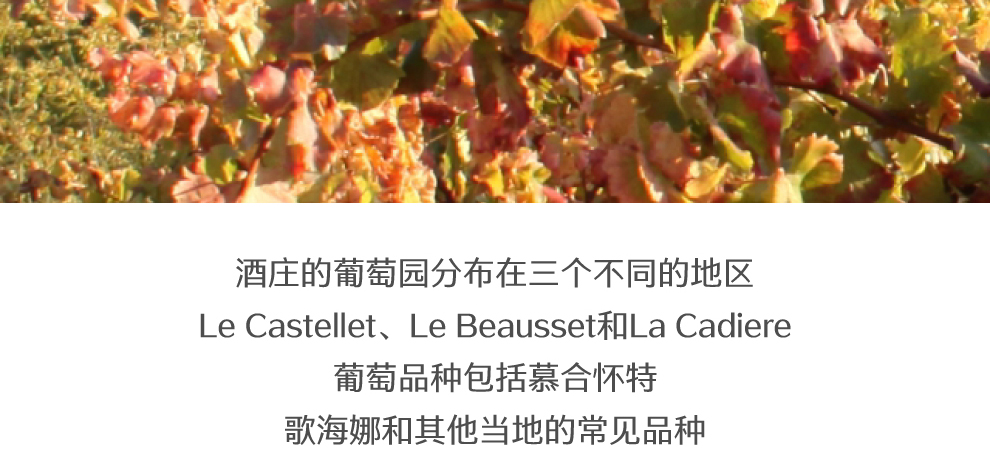Domaine Tempier酒庄位于普罗旺斯的Castellet不远的地方,它的葡萄园分布在三个不同的地区:Le Castellet、Le Beausset和La Cadiere。葡萄品种有慕合怀特,歌海娜和其他当地的常见品种。