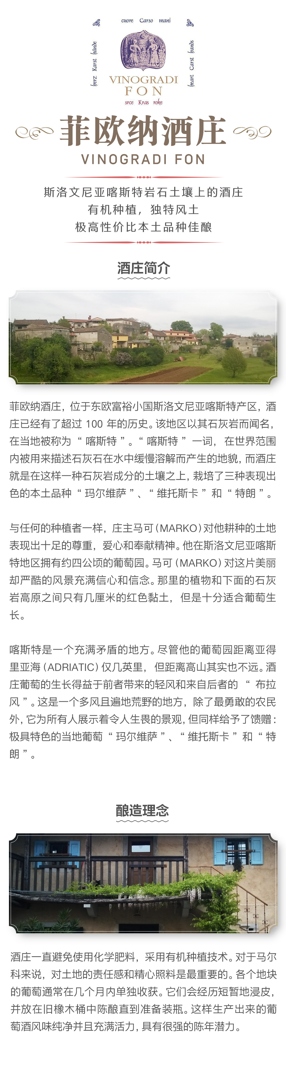 菲欧纳酒庄,位于东欧富裕小国斯洛文尼亚喀斯特产区,酒庄已经有了超过100年的历史。该地区以其石灰岩而闻名,在当地被称为“喀斯特”。“喀斯特”一词,在世界范围内被用来描述石灰石在水中缓慢溶解而产生的地貌,而酒庄就是在这样一种石灰岩成分的土壤之上,栽培了三种表现出色的本土品种“玛尔维萨”、 “维托斯卡”和“特朗”。