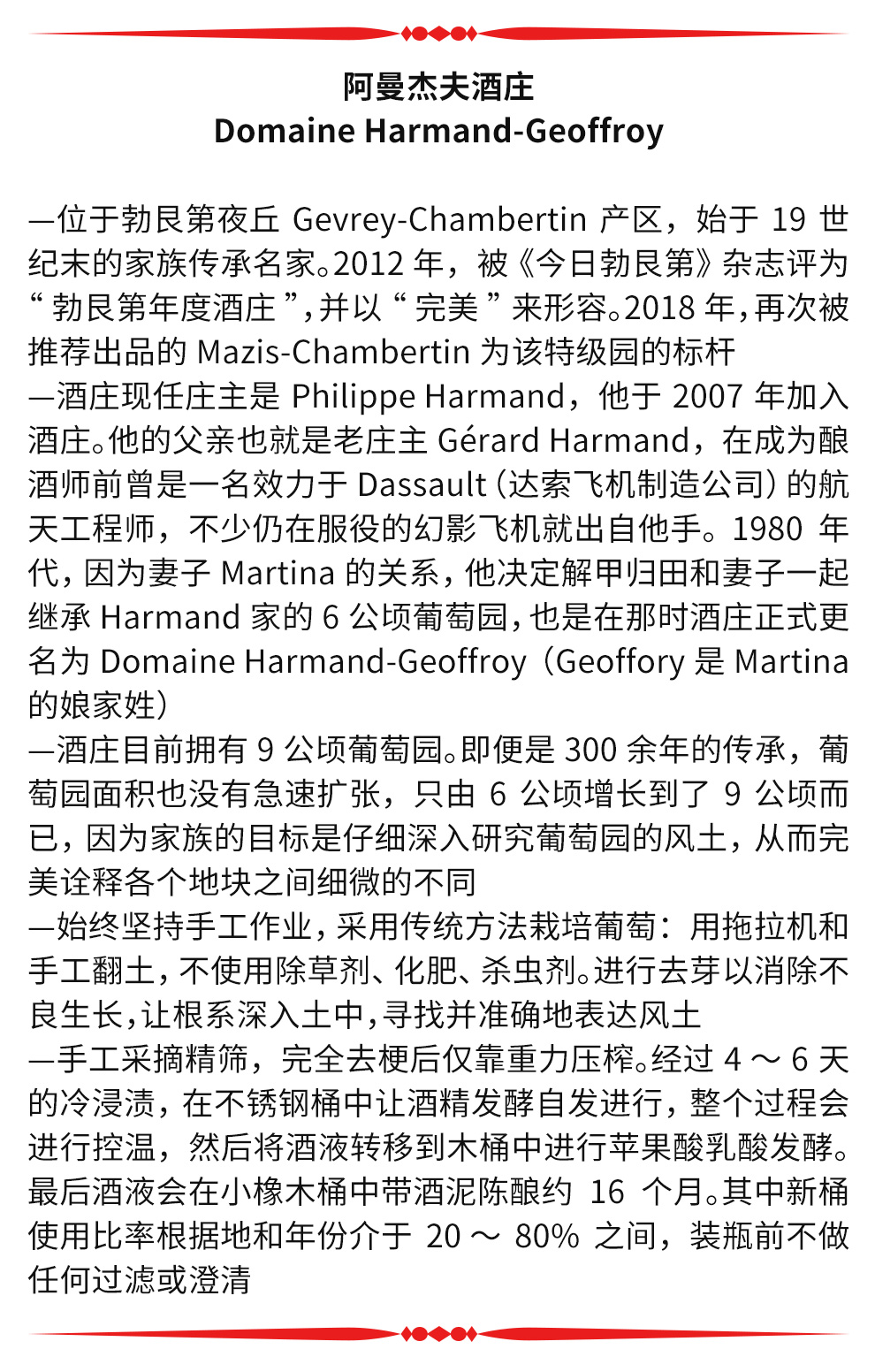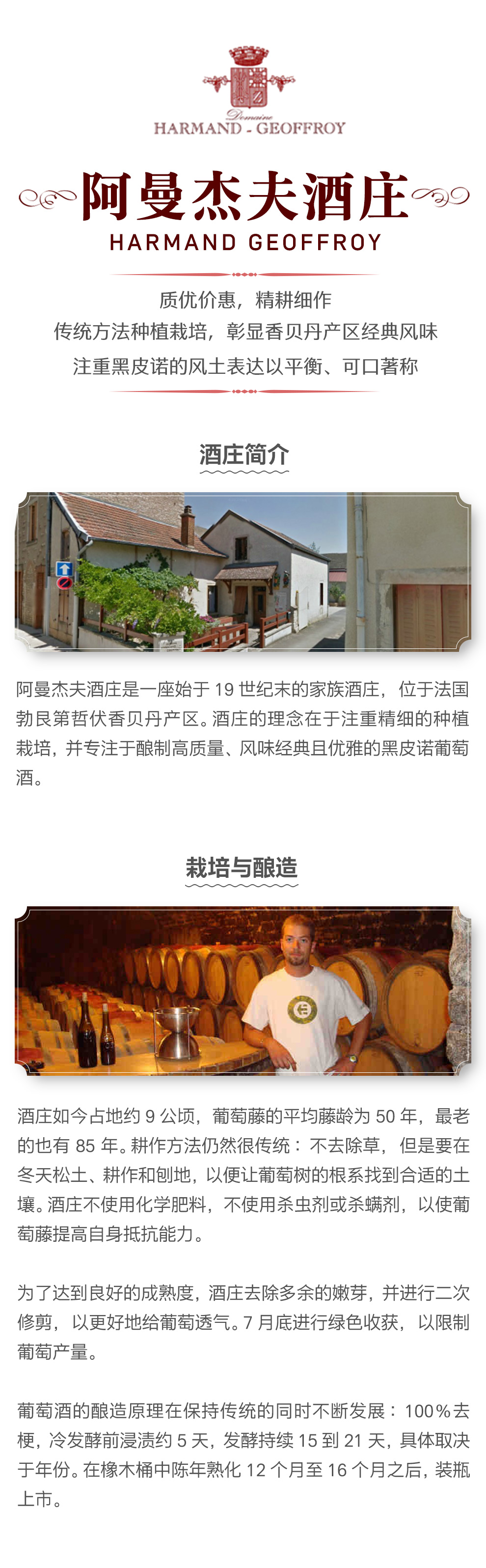 阿曼杰夫酒庄是一座始于19世纪末的家族式酒庄,位于法国勃艮第的哲伏香贝丹产区。酒庄发展的核心就是靠“精细的种植栽培”,专注于做高质量的,风味经典且优雅的黑皮诺葡萄酒。