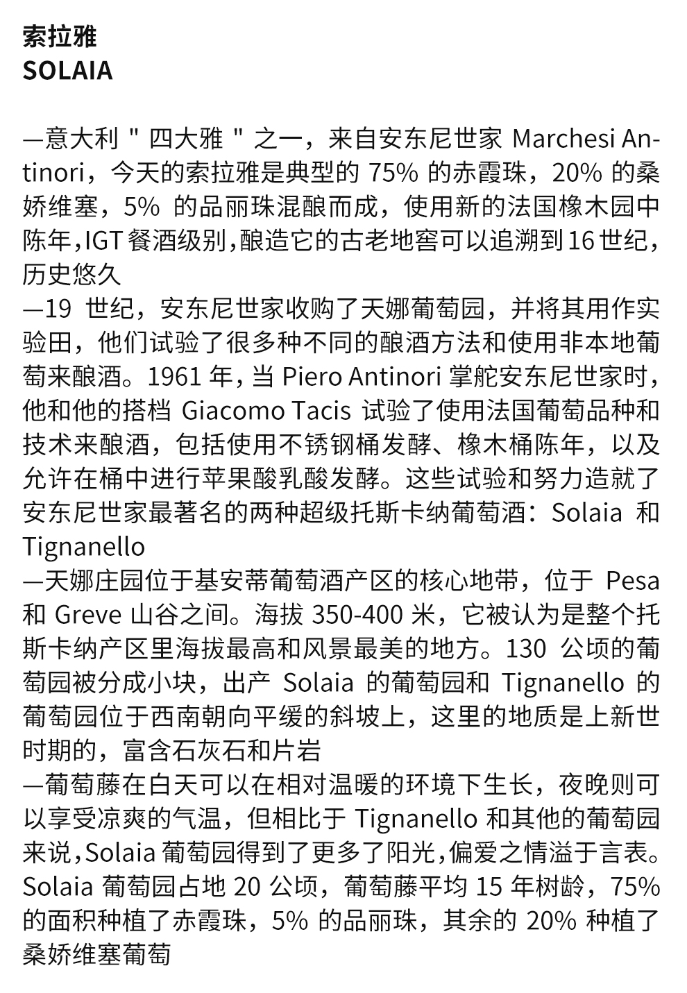 ANTINORI旗下 SOLAIA(索拉雅)和 TIGNANELLO(天娜)两个高端品牌的品质可以与法国顶级名庄酒媲美, SOLAIA(索拉雅)1997 年份酒,被全球最权威的美国《葡萄酒观察家》杂志评为 2000 年全球“百大葡萄酒”的第一名,也是第一个获得此荣誉的意大利葡萄酒,一举确立了 SOLAIA 在全球顶级葡萄酒中的领袖地位。改变了全球红酒爱好者意大利少出顶级酒的认知,提升了意大利葡萄酒在全球市场的地位。