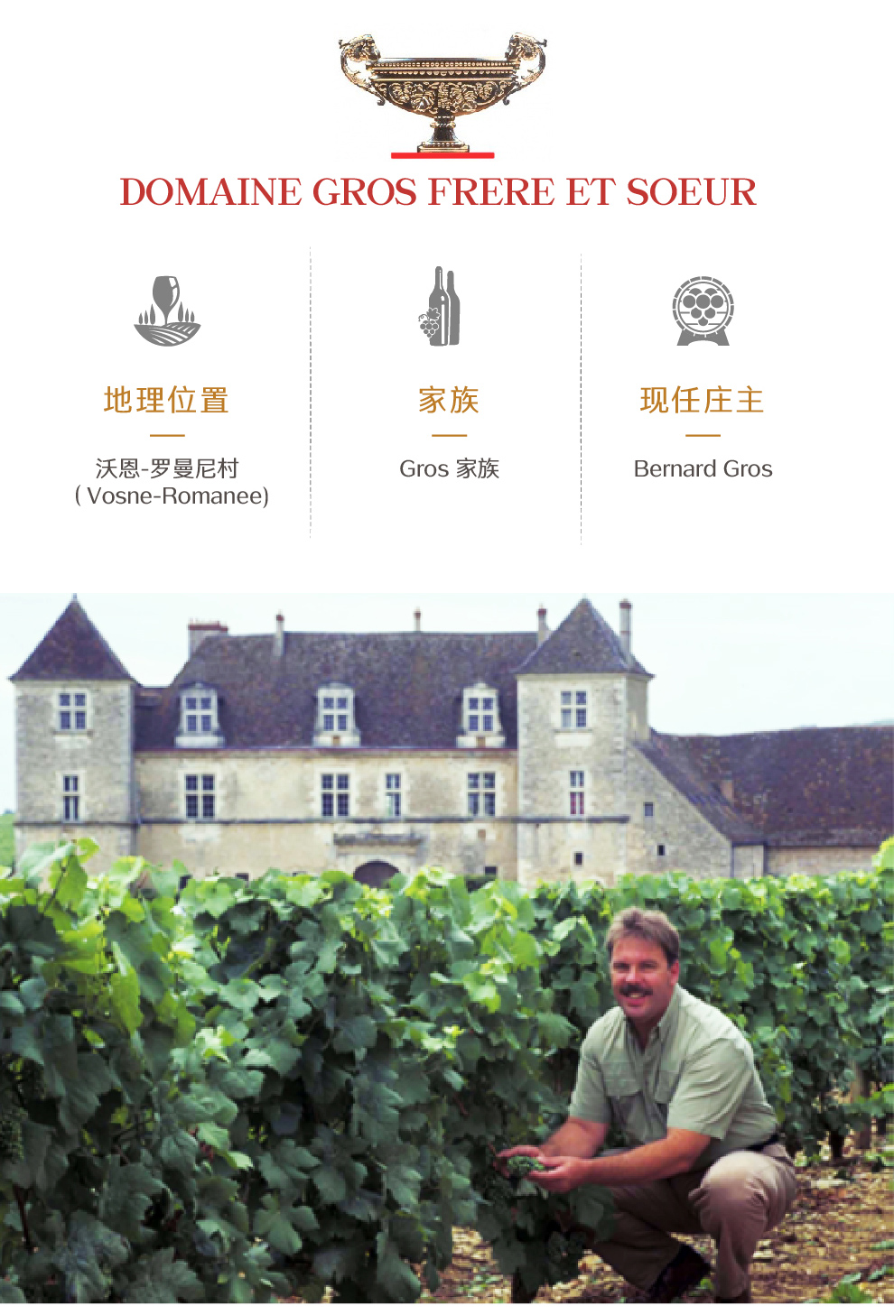 Gros 家族是Vosne-Romanee村著名的酿酒世家,酒庄经过了Louis和Jean Gros(现任庄主Bernard的父亲,曾经担任本村两任的市场)两代的辛勤经营,创造出了备受瞩目的酿酒王朝,成为仅次于Domaine Romanee-Conti的超明星酒庄。
