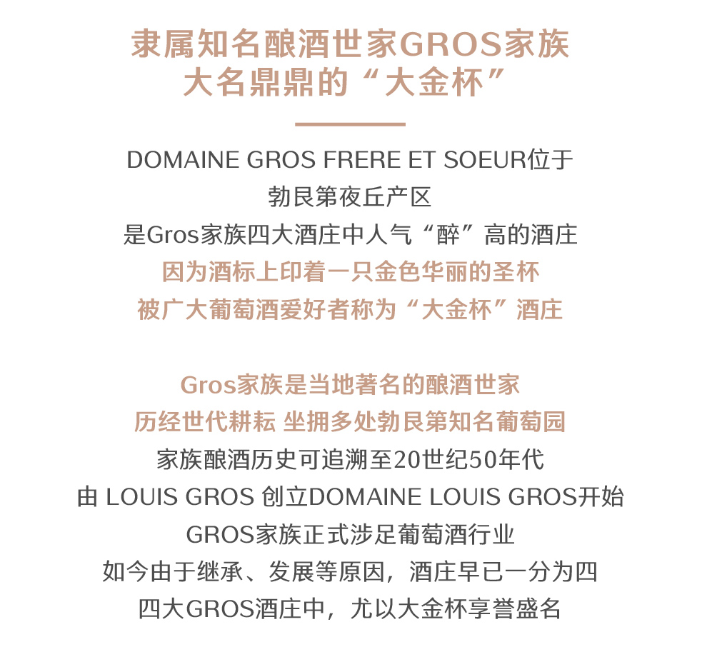 Domaine Gros Frere & Soeur 是勃艮第Cotes de Nuits (夜丘)Vosne-Romanee村Gros 家族四大酒庄中人气最高的酒庄。因为酒标上印着一只金色华丽的圣杯,台湾的勃艮第酒友就给他取了个“大金杯”的外号。