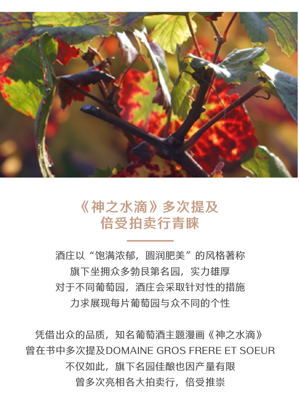 Domaine Gros Frere & Soeur 坐拥Vosne-Romanée村的顶级葡萄园,常常是品酒会以及拍卖会上备受瞩目的焦点。尤其是特级葡萄园的Richebourg Grand Cru(约 0.7ha)、Grands Echezeaux Grand Cru(约 0.3ha)与 Clos Vougeot Grand Cru "Musigni"(约 1.5ha,特级葡萄园Musigny 旁)。