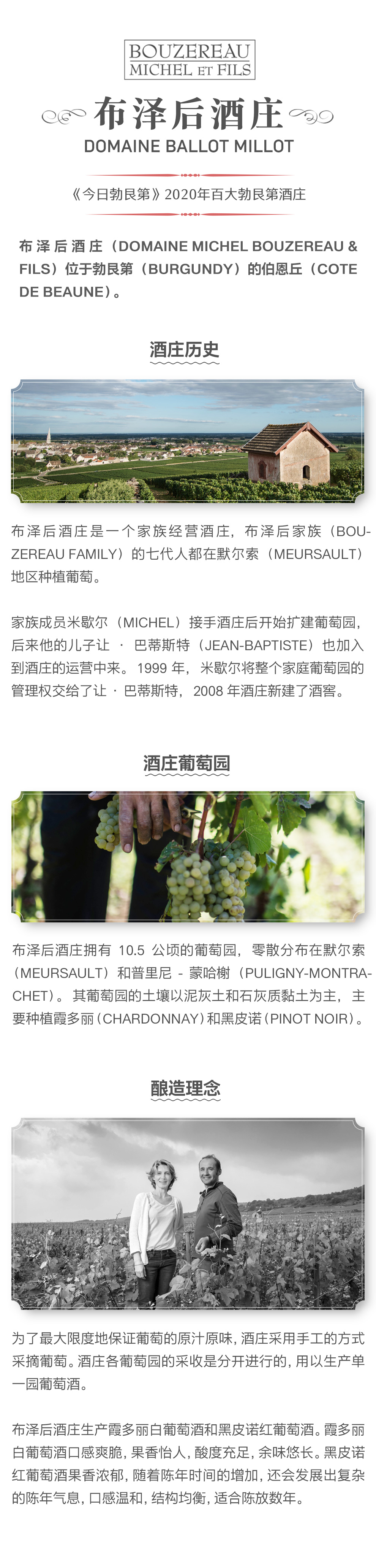 布泽后酒庄是一个家族经营酒庄,布泽后家族(Bouzereau family)的七代人都在默尔索(Meursault)地区种植葡萄。