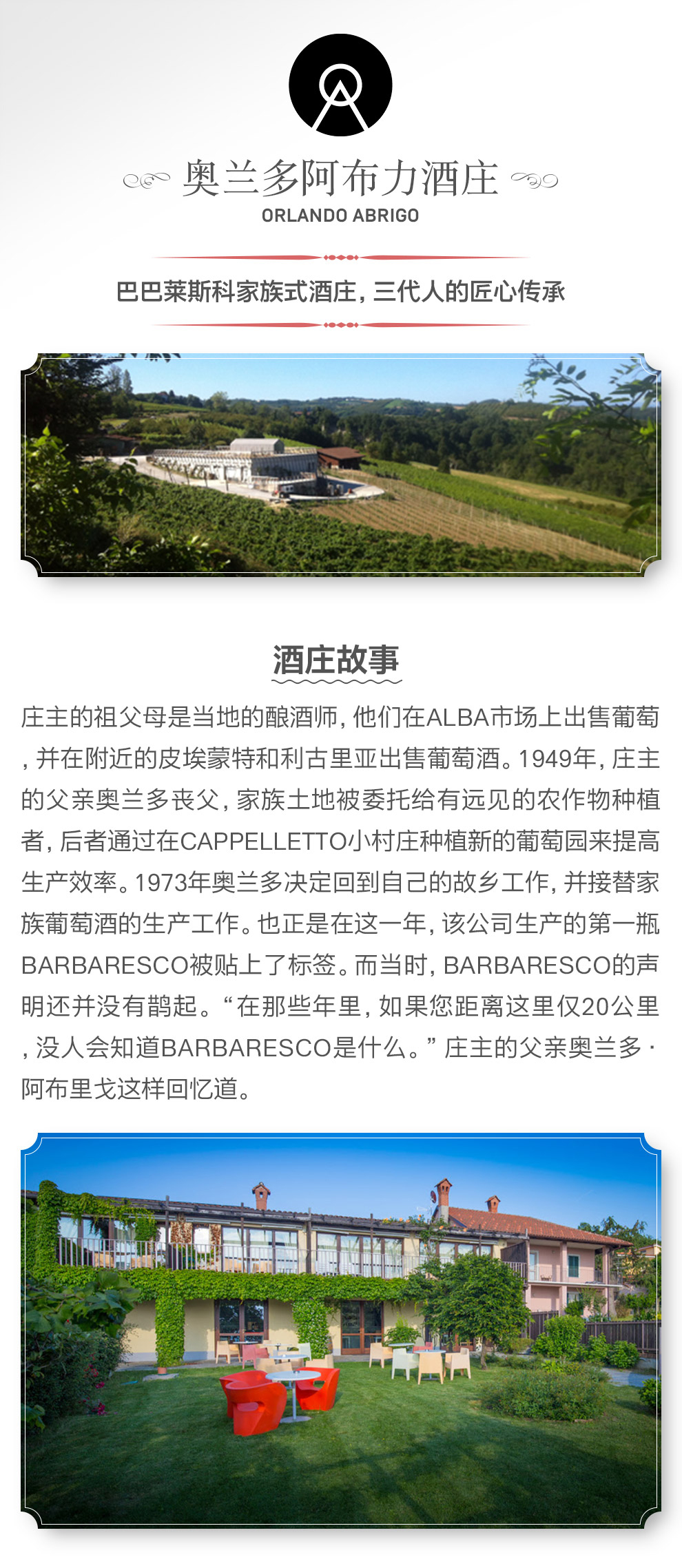 庄主乔瓦尼的祖父母是当地的酿酒师。1949年,庄主的父亲奥兰多丧父,家族土地被委托给有远见的农作物种植者,后者在Cappelletto小村庄种植新的葡萄园以提高生产效率。1973年奥兰多决定回到自己的故乡工作,并接替家族葡萄酒的生产工作。也正是在这一年,该公司生产的第一瓶Barbaresco被贴上了标签。而当时,Barbaresco还并没有真正地声名鹊起。“在那些年里,如果您距离这里仅20公里,没人会知道Barbaresco是什么。”庄主的父亲奥兰多这样回忆道。