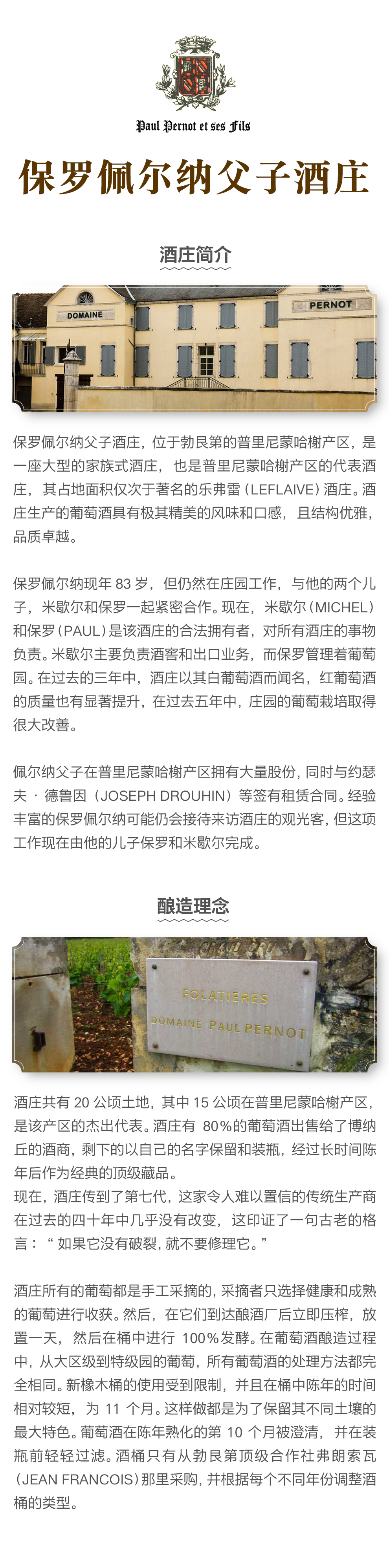 保罗佩尔纳父子酒庄,位于勃艮第的普里尼蒙哈榭产区,是一座大型的的家族式酒庄,也是普里尼蒙哈榭产区的代表酒庄,其占地面积仅次于著名的乐弗雷(Leflaive)酒庄。酒庄生产的葡萄酒具有极其精美的风味和口感,且结构优雅,品质卓越。