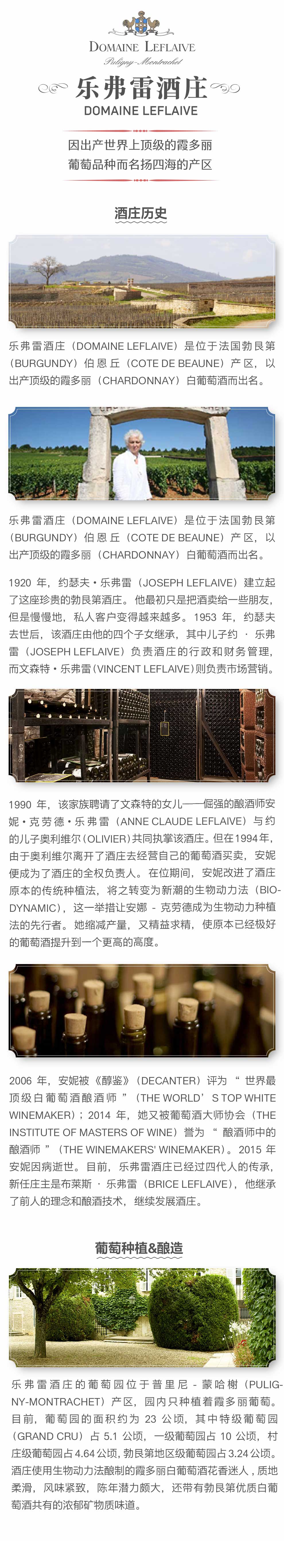 2006年,安妮被《醇鉴》(Decanter)评为“世界最顶级白葡萄酒酿酒师”(The World’s Top White Winemaker);2014年,她又被葡萄酒大师协会(the Institute of Masters of Wine)誉为“酿酒师中的酿酒师”(The Winemakers' Winemaker)。2015年安妮因病逝世。目前,勒弗莱酒庄已经过四代人的传承,新任庄主是布莱斯·勒弗莱(Brice Leflaive),他继承了前人的理念和酿酒技术,继续发展酒庄。勒弗莱酒庄的葡萄园位于普里尼-蒙哈榭(Puligny-Montrachet)产区,园内只种植着霞多丽葡萄。目前,葡萄园的面积约为23公顷,其中特级葡萄园(Grand Cru)占5.1公顷,一级葡萄园占10公顷,村庄级葡萄园占4.64公顷,勃艮第地区级葡萄园占3.24公顷。酒庄坚持使用,生物动力法酿制的霞多丽白葡萄酒花香迷人,质地柔滑,风味紧致,陈年潜力颇大,还带有勃艮第优质白葡萄酒共有的浓郁矿物质味道。