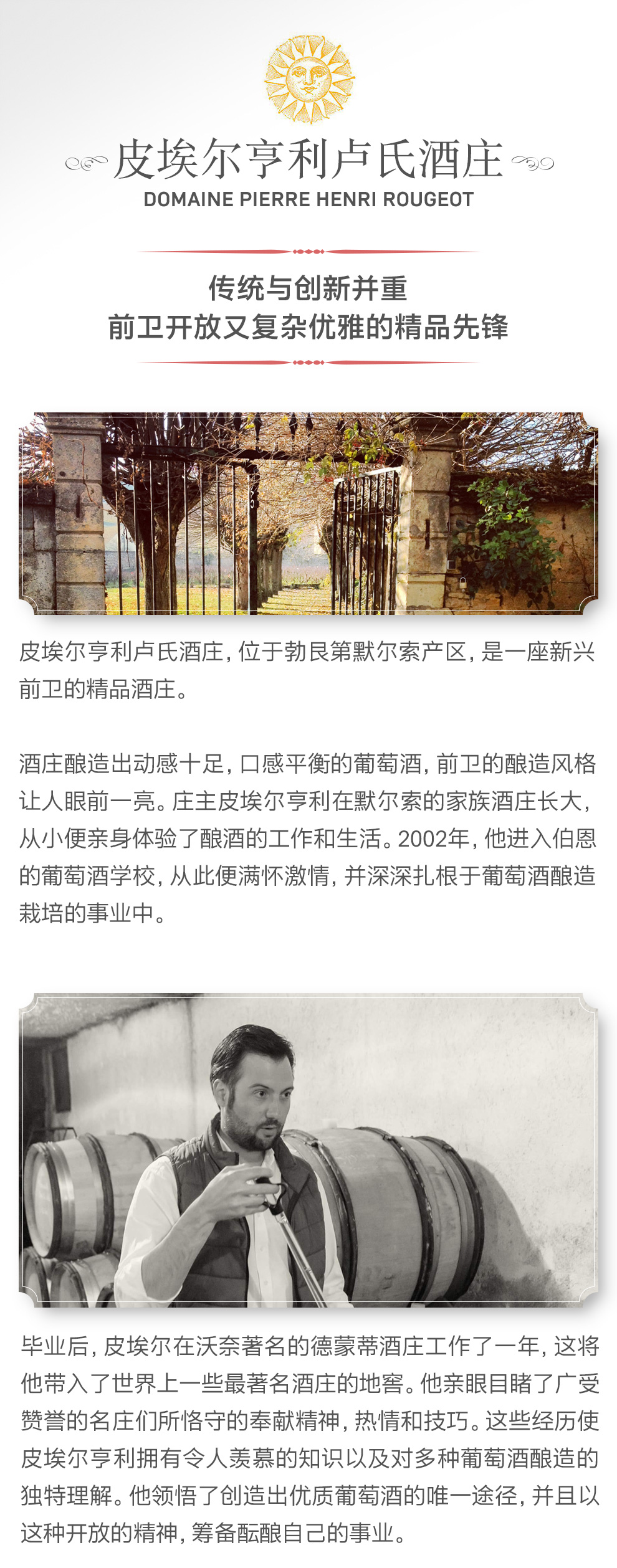 酒庄酿造出动感十足,口感平衡的葡萄酒,前卫的酿造风格使之荡漾。庄主皮埃尔亨利在默尔索的家族酒庄长大,从小便亲身体验了酿酒的工作和生活。2002年,他进入伯恩的葡萄酒学校,从此便满怀激情地,深深扎根于葡萄酒酿造栽培的事业中。