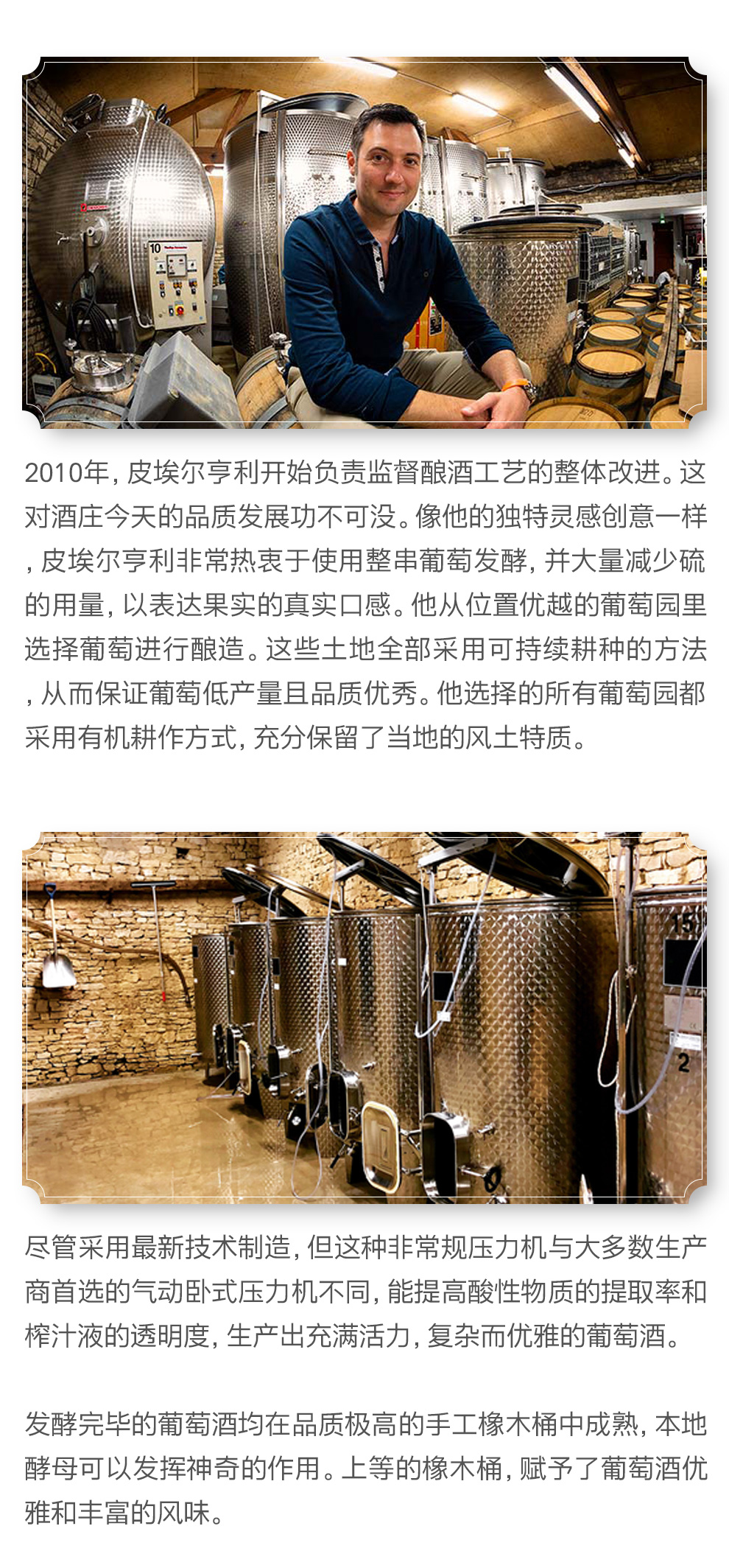 2010年,皮埃尔亨利开始负责监督酿酒工艺的整体改进。这对酒庄今天的品质发展功不可没。像他的独特灵感创意一样,皮埃尔亨利非常热衷于使用整束葡萄发酵,并大量减少硫的用量,促进表达果实的真实口感。他从位置优越的葡萄园里选择葡萄进行酿造。这些土地全部采用可持续耕种的方法,从而保证葡萄低产量且品质优秀。他选择的所有葡萄园都采用有机耕作方式,充分保留了当地的风土特质。