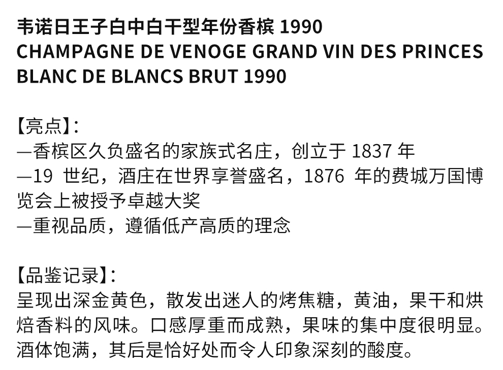 酒庄实行“低产量、高质量”的葡萄酒生产标准,只选用压榨过一次的葡萄,并且上市前都经过很长时间的陈年。到了今天,韦诺日酒庄已经成为香槟产区核心的知名酒庄之一,并且以其高质量和精美的风味名扬海内外。