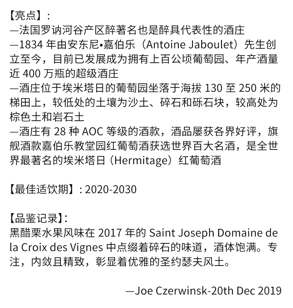 嘉伯乐酒庄(Domaine Paul Jaboulet Aine)是法国罗纳河谷产区最著名也是最具代表性的酒庄,1834年由安东尼•嘉伯乐(Antoine Jaboulet)先生创立至今,目前已发展成为拥有上百公顷葡萄园、年产酒量近400万瓶的超级酒庄。
