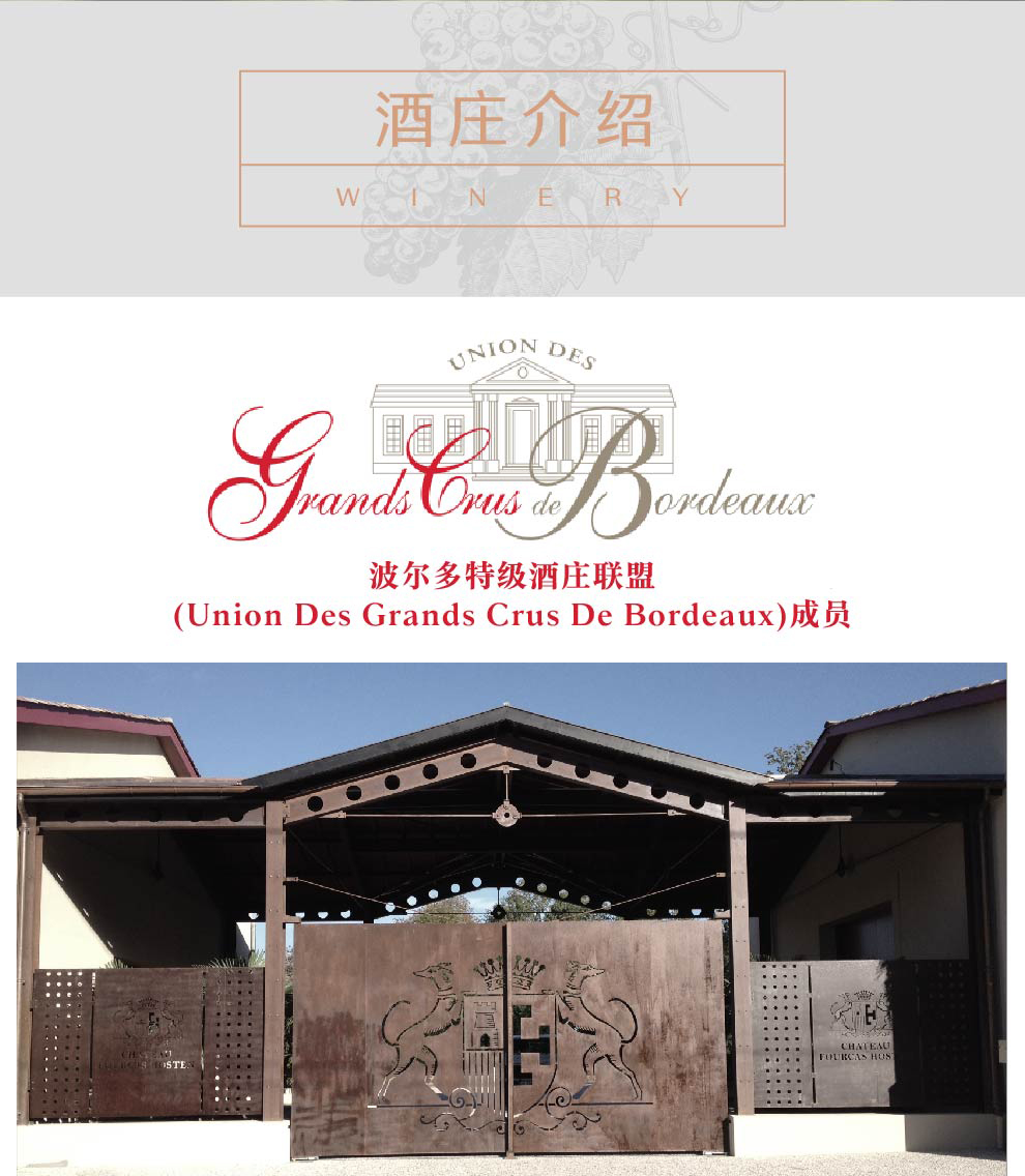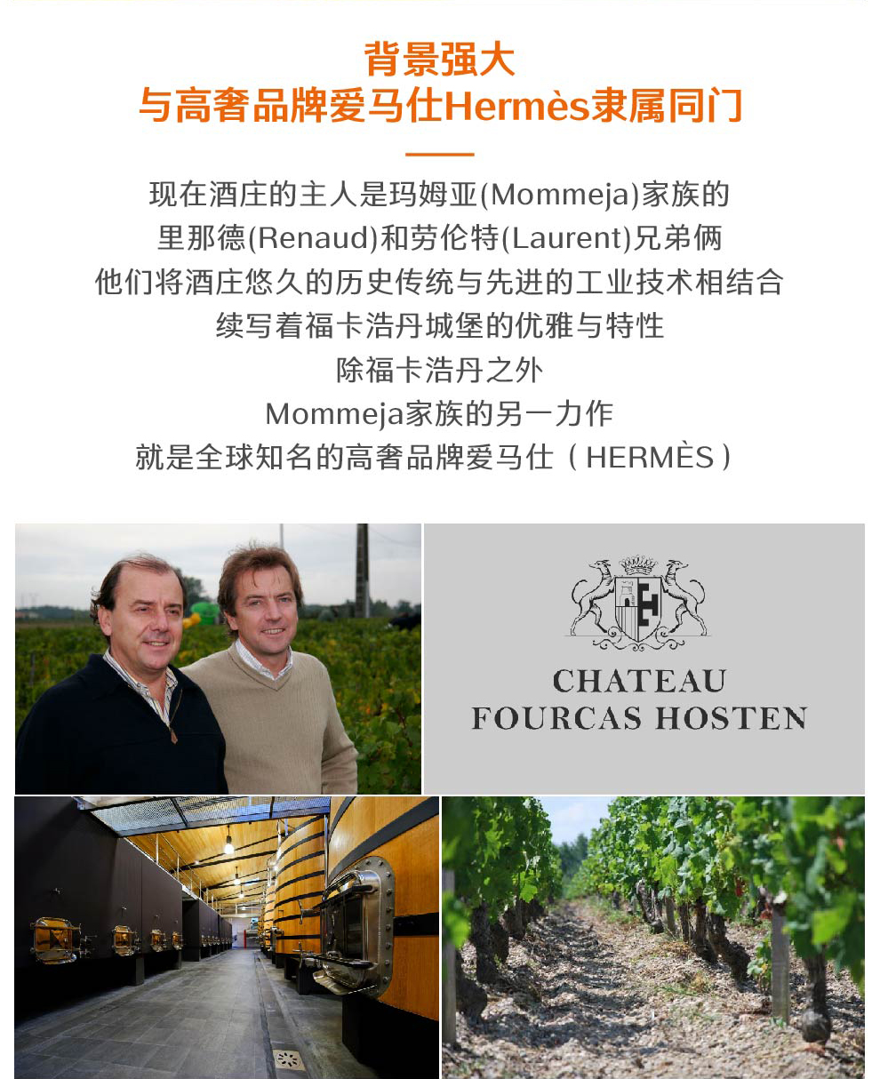 福卡浩丹城堡拥有独具特色的风土条件。200多年以来,城堡用其精妙平衡的葡萄酒赢得了高品质的声誉。酒庄遵从古老的酿酒传统,还掌握着梅多克式的酿造工艺。新主人玛姆亚(Mommeja)家族的里那德(Renaud)和劳伦特(Laurent)兄弟继续秉承着城堡悠久的历史传统,他们用最先进的工具和最现代化的技术,酿制出福卡浩丹城堡葡萄酒的优雅与特性。