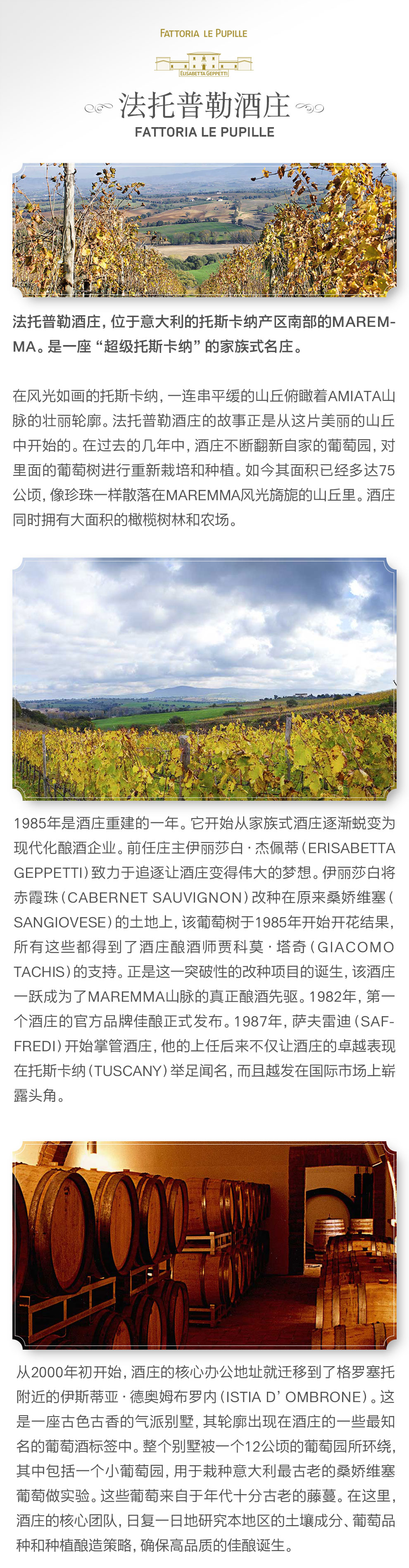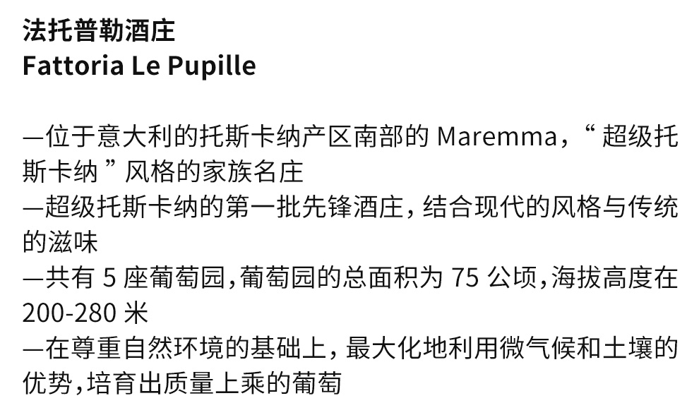 法托普勒酒庄,位于意大利的托斯卡纳产区南部的Maremma。是一座“超级托斯卡纳”的家族式名庄。