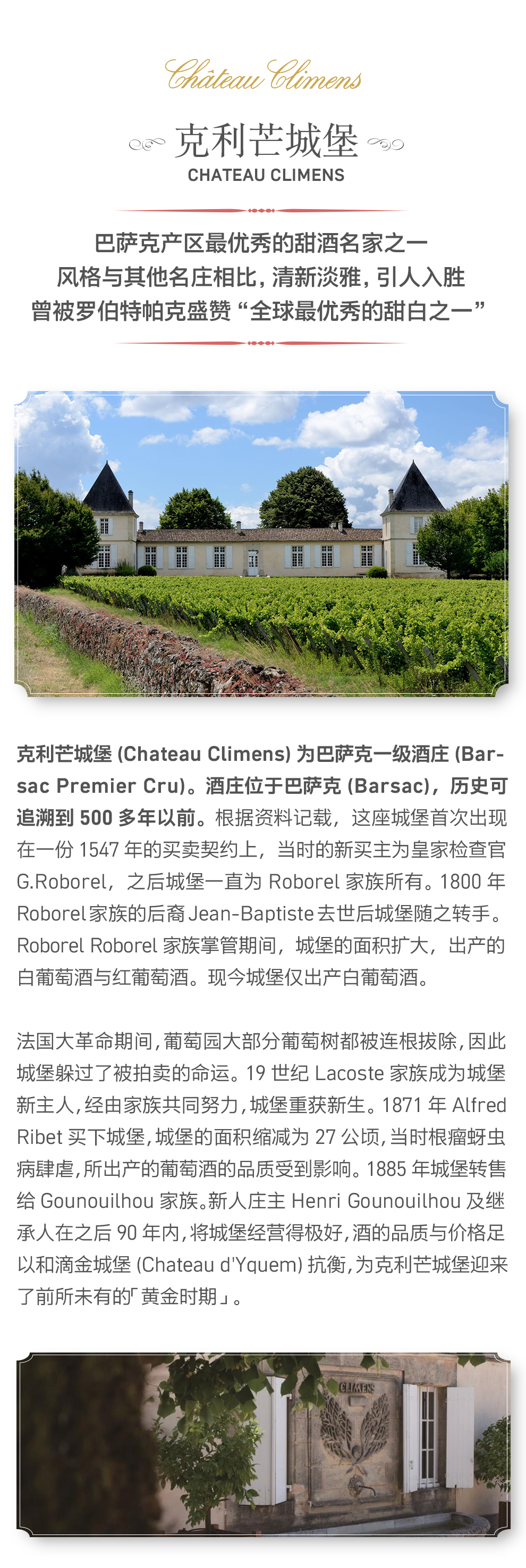 克利芒城堡(Chateau Climens)为巴萨克一级酒庄(Barsac Premier Cru)。酒庄位于巴萨克(Barsac),历史可追溯到500多年以前。根据资料记载,这座城堡首次出现在一份1547年的买卖契约上,当时的新买主为皇家检查官G.Roborel,之后城堡一直为Roborel家族所有。 1800年Roborel家族的后裔Jean-Baptiste去世后城堡随之转手。 Roborel Roborel家族掌管期间,城堡的面积扩大,出产的白葡萄酒与红葡萄酒。现今城堡仅出产白葡萄酒。