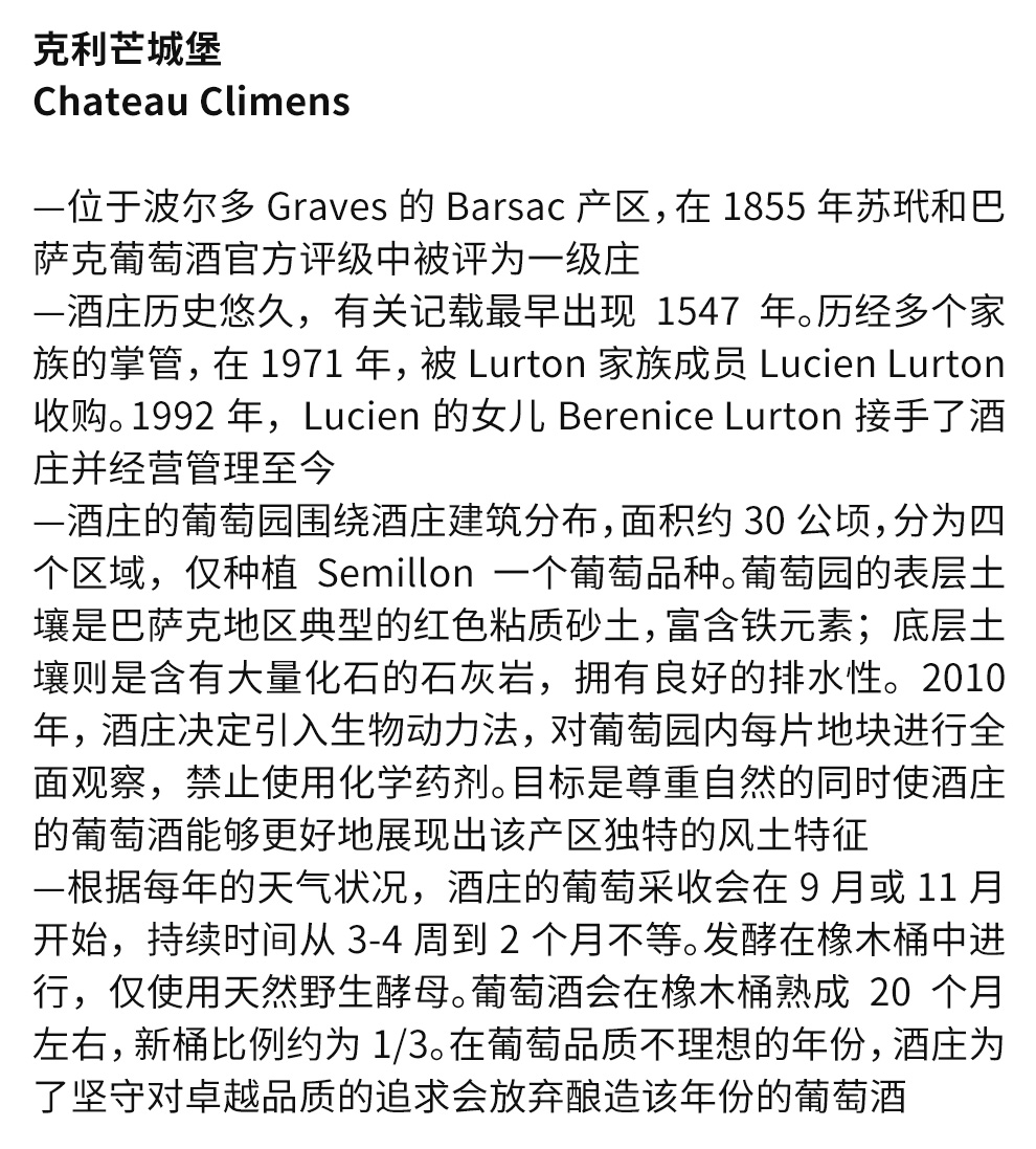 克利芒城堡(Chateau Climens)为巴萨克一级酒庄(Barsac Premier Cru)。酒庄位于巴萨克(Barsac),历史可追溯到500多年以前。根据资料记载,这座城堡首次出现在一份1547年的买卖契约上,当时的新买主为皇家检查官G.Roborel,之后城堡一直为Roborel家族所有。 1800年Roborel家族的后裔Jean-Baptiste去世后城堡随之转手。 Roborel Roborel家族掌管期间,城堡的面积扩大,出产的白葡萄酒与红葡萄酒。现今城堡仅出产白葡萄酒。