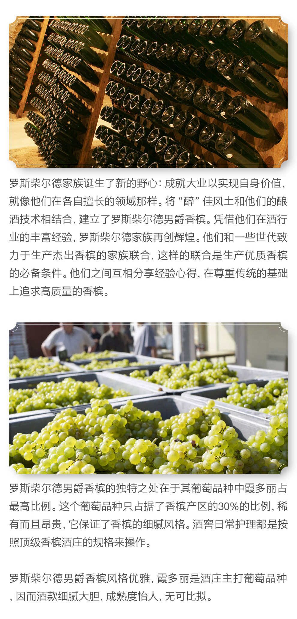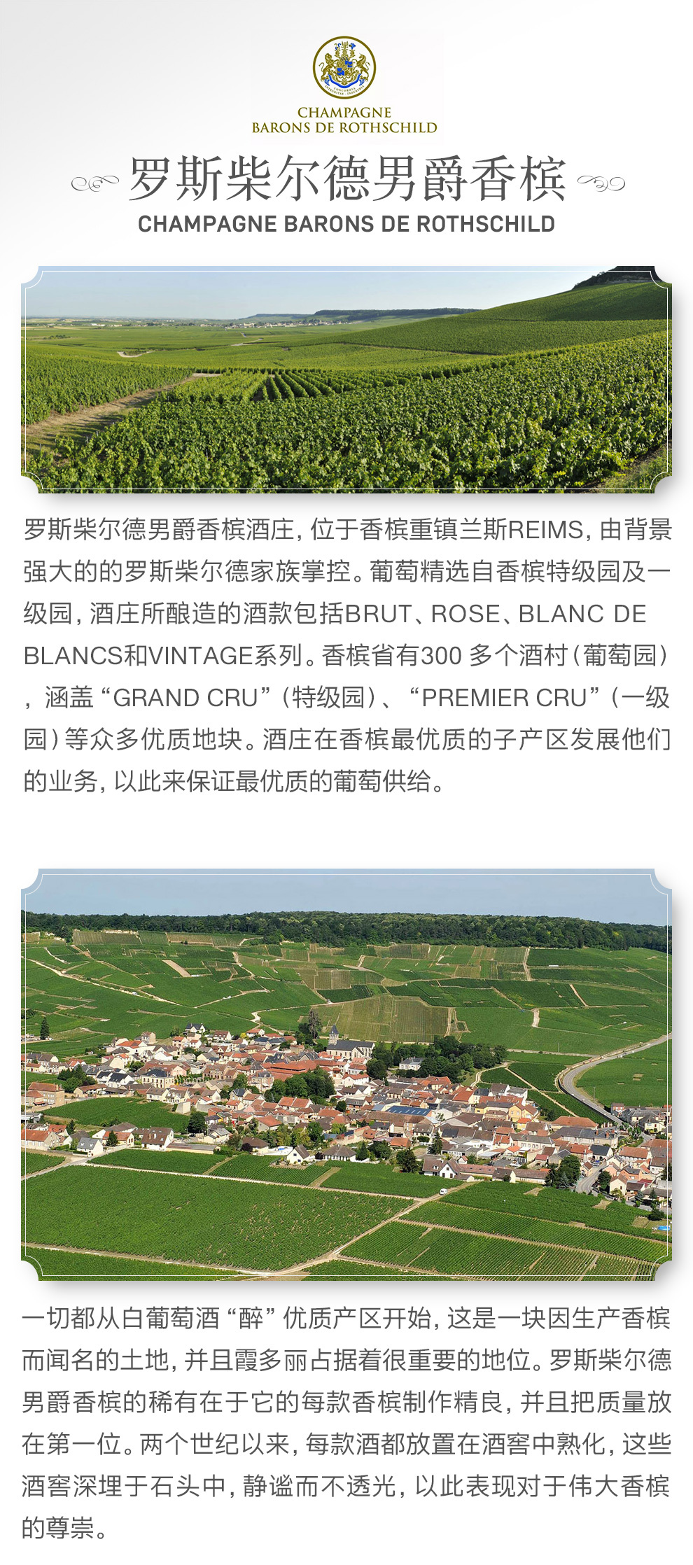 罗斯柴尔德男爵香槟酒庄,位于香槟重镇兰斯Reims,由背景强大的的罗斯柴尔德家族掌控。葡萄精选自香槟的特级园及一级园,酒庄所酿造的酒款包括Brut、Rose、Blanc de Blancs和Vintage系列。香槟省有300 多个酒村(葡萄园), 17个“Grand Cru”(特级园); “Premier Cru”(一级园)共有40 个左右。酒庄在香槟最优质的产区发展他们的业务,以此来保证最优质的葡萄供给。
