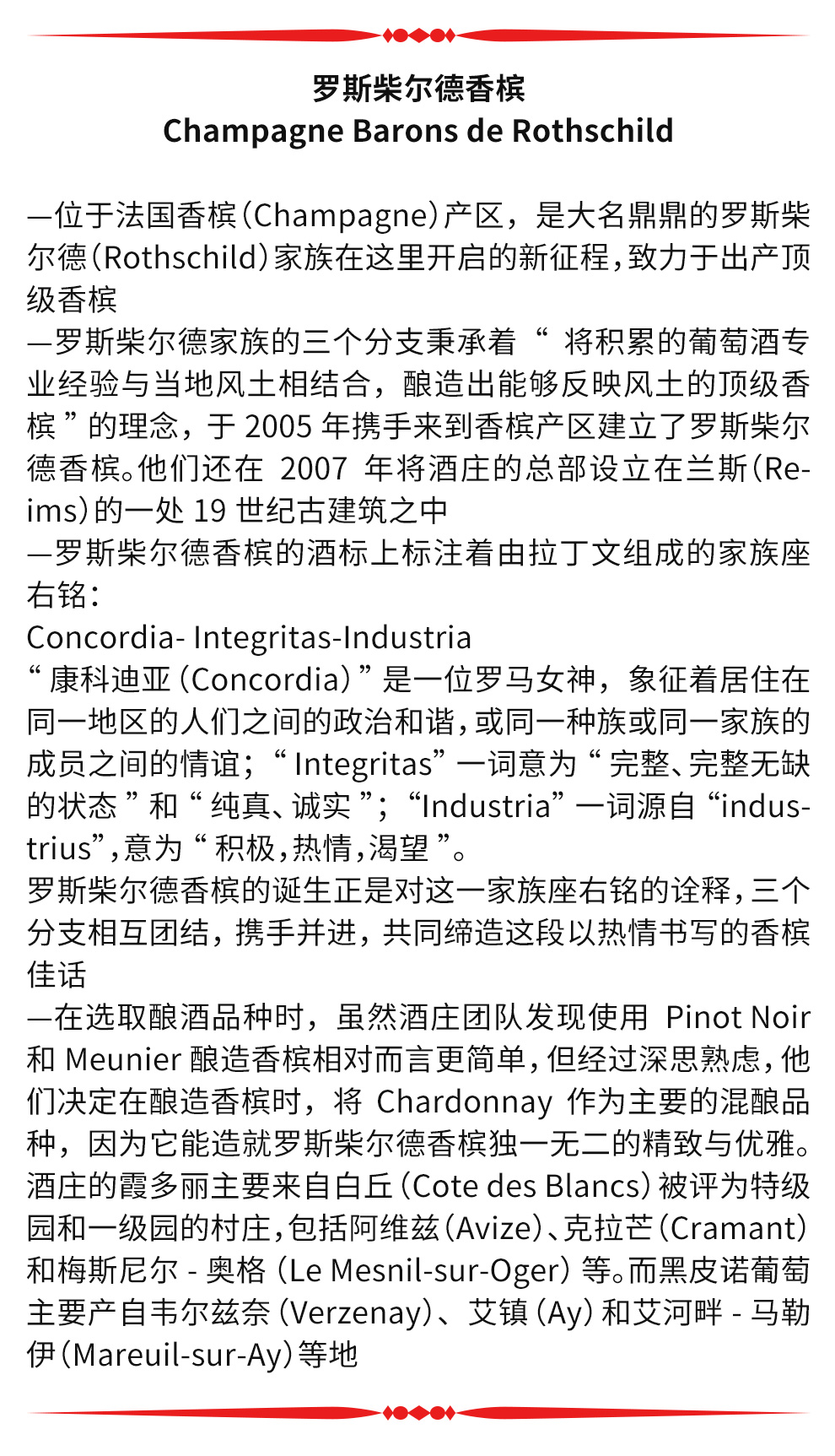 罗斯柴尔德男爵香槟酒庄,位于香槟重镇兰斯Reims,由背景强大的的罗斯柴尔德家族掌控。葡萄精选自香槟的特级园及一级园,酒庄所酿造的酒款包括Brut、Rose、Blanc de Blancs和Vintage系列。香槟省有300 多个酒村(葡萄园), 17个“Grand Cru”(特级园); “Premier Cru”(一级园)共有40 个左右。酒庄在香槟最优质的产区发展他们的业务,以此来保证最优质的葡萄供给。