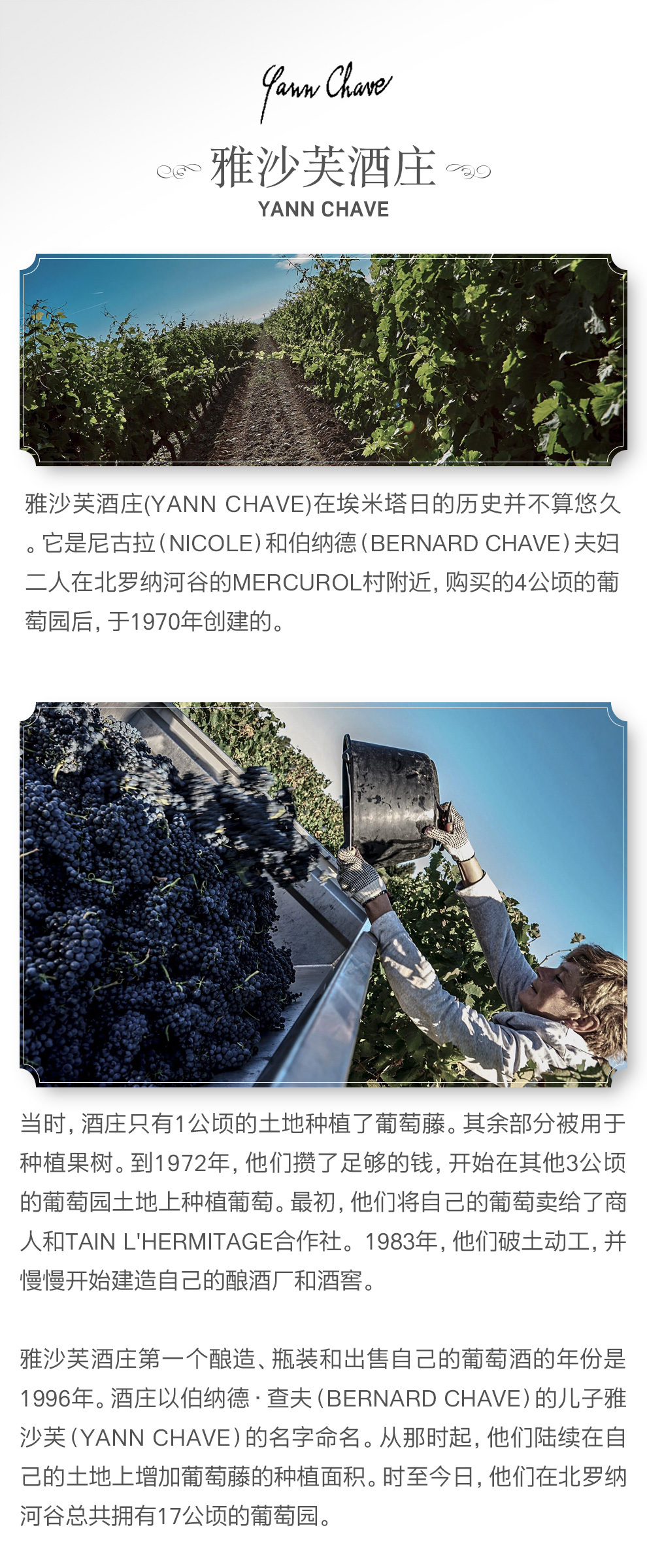 雅沙芙酒庄(YANN CHAVE)在埃米塔日的历史并不算悠久。它是尼古拉(Nicole)和伯纳德(Bernard Chave)夫妇二人在北罗纳河谷的Mercurol村附近,购买的4公顷的葡萄园后,于1970年创建的。
