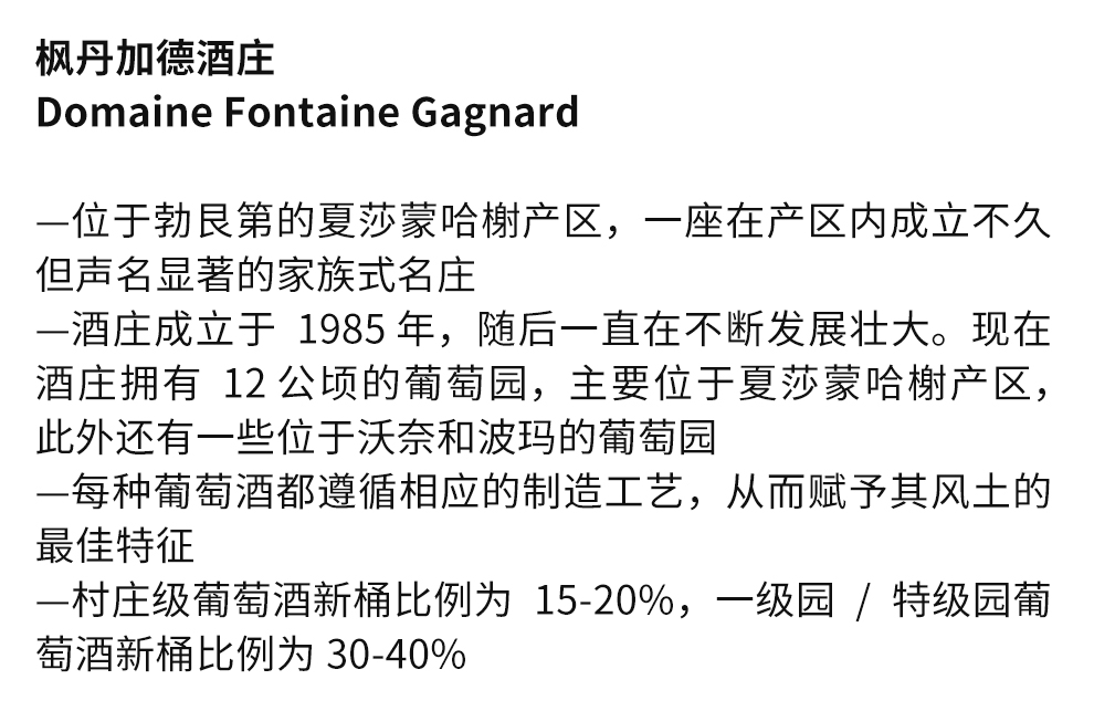 枫丹加德酒庄,位于勃艮第的夏莎蒙哈榭产区。是一座在产区内成立不久但声名显著的家族式名庄。几个世纪以来,枫丹加德家族一直在全心全意地耕种葡萄园。酒庄成立于 1985 年,随后一直在不断发展壮大。现在酒庄拥有共计 12 公顷的葡萄园,主要位于夏莎蒙哈榭产区,此外还有一些位于沃奈和波玛的地块。