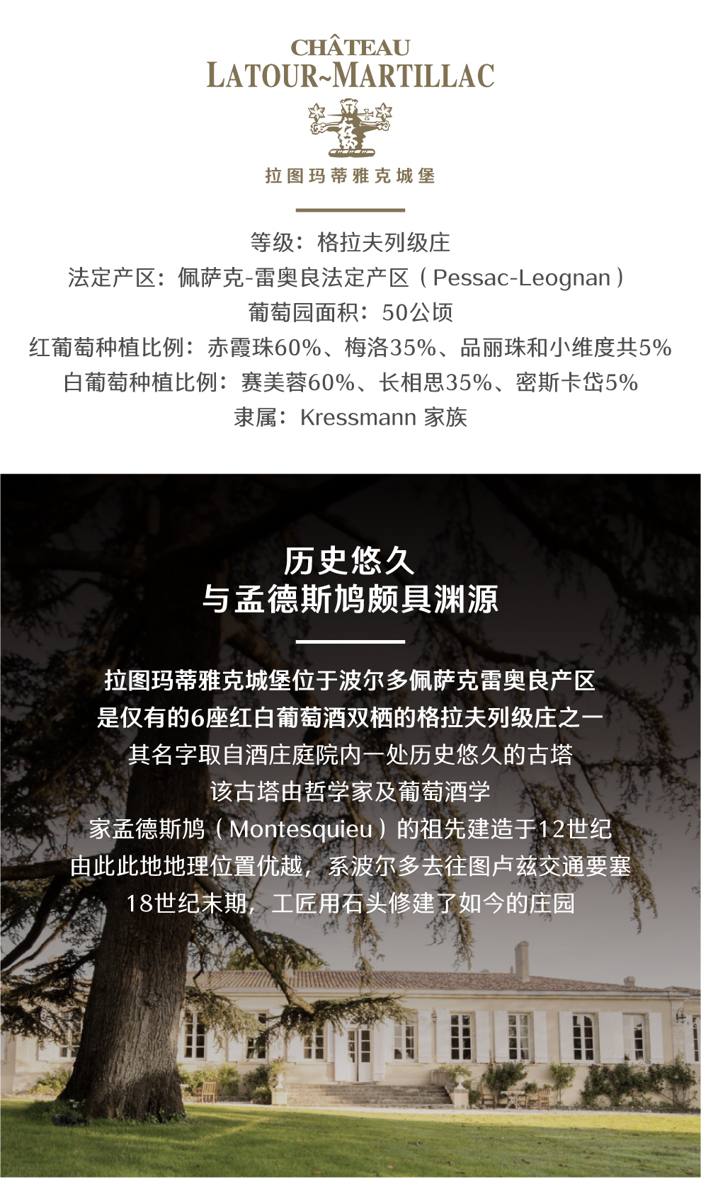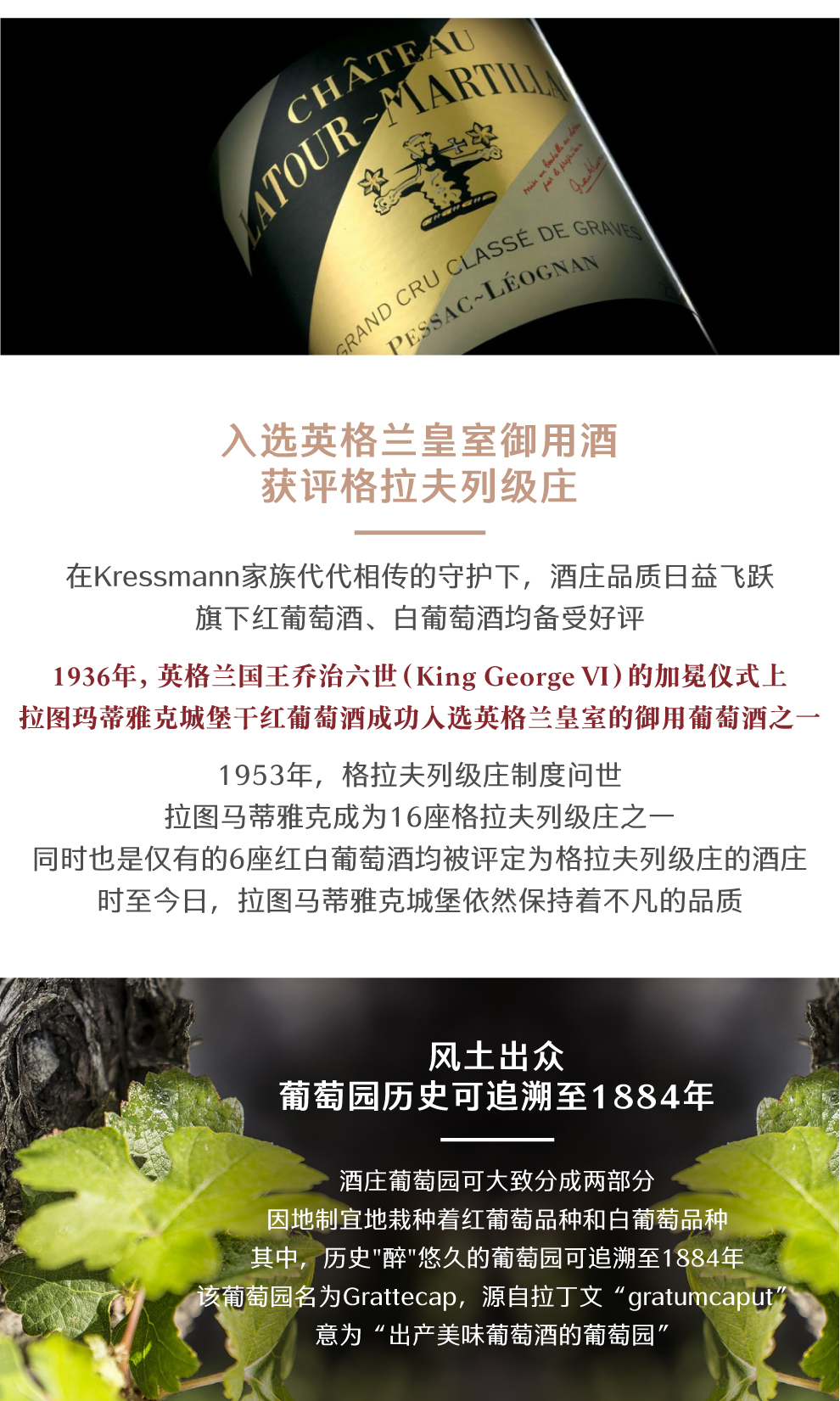 经过克莱斯曼家族几代人的不懈努力,在1953年格拉夫分级评定中,拉图玛蒂雅克酒庄终于出现在佩萨克-雷奥良产区列级酒庄名录中。