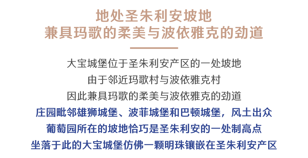 首先是风土条件。大宝庄距波尔多西北40公里,位于梅多克中心的圣朱利安产区。在1885年分级中,圣朱利安产区的18个酒庄中有12个榜上有名,但无一、五级,只分别处在二、三、四级,这证明了圣朱利安产区各酒庄的整体素质非常高和均衡。而且大宝庄位于圣朱利安最高的坡地处,拥有非常好的风土条件。土壤属于地质学第四纪的冲积土,以砾石为主,而且被溪流分割,葡萄园被水流包围。大宝庄有107公顷葡萄园,是梅多克产区第二大面积的葡萄园。其中有102公顷种植着红葡萄品种,5公顷种植白葡萄。