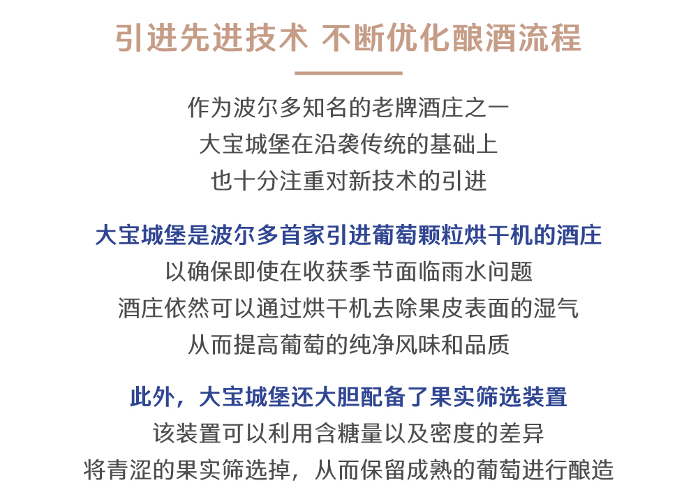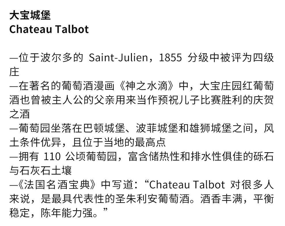 Talbot的酒质一贯很稳定,优良的酒质加上大宝庄的英文、法文发音都非常易记,朗朗上口,这也令“大宝”成为了世界知名的法国名庄。