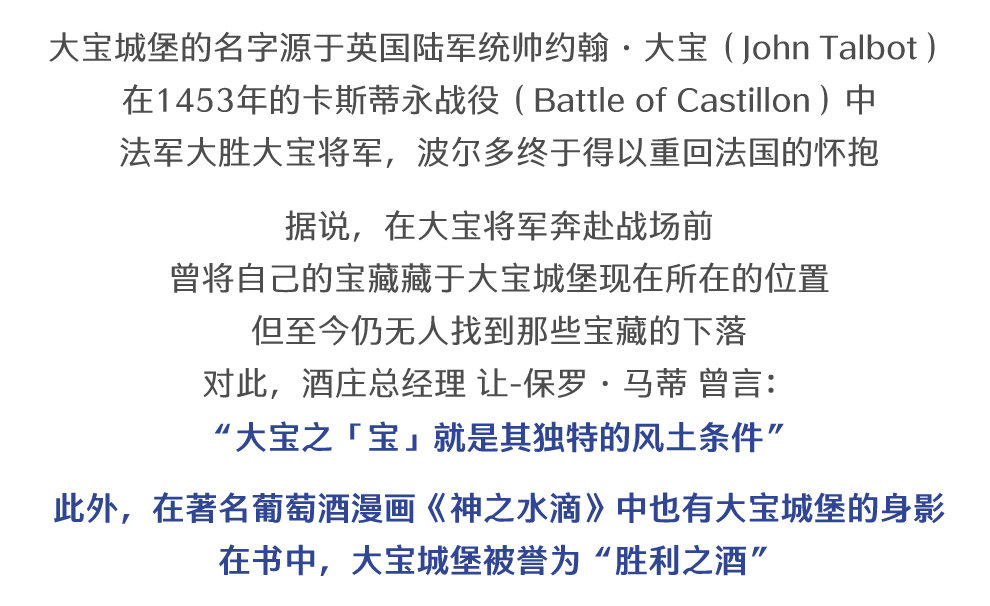 大宝酒庄的历史非常丰富,它的名字来源于英国一个著名的陆军统帅大宝先生(Talbot),他是吉耶纳地区(Guyenne)的总督,在1453年卡斯蒂永(Castillon)战役中被法军打败,从此结束了英法百年战争这段不堪回首的历史。