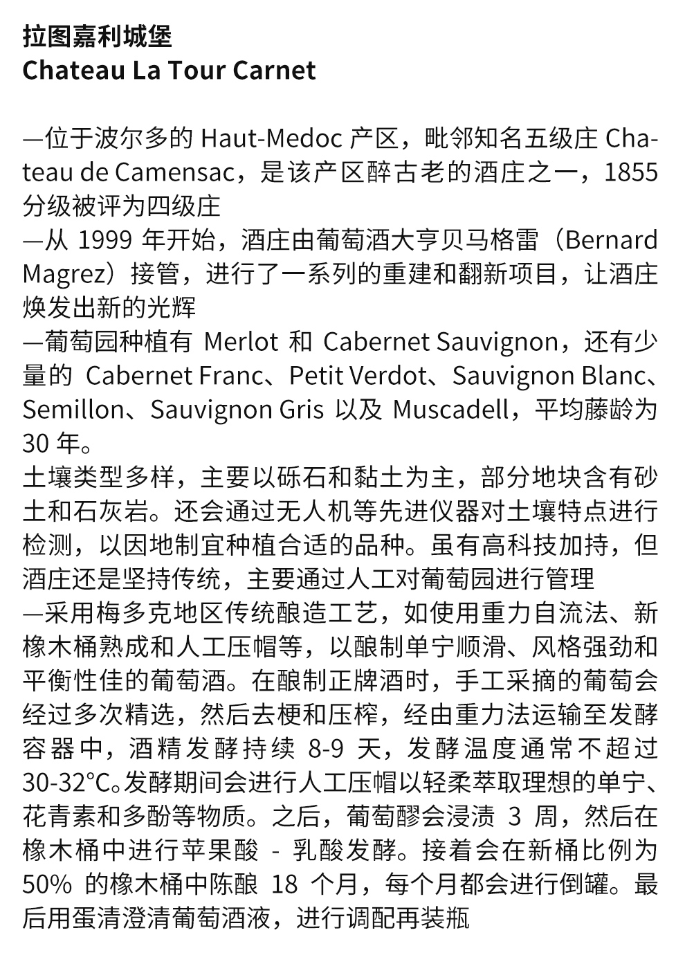 拉图嘉利于1999年被大名鼎鼎的酒商BernardMagrez贝尔纳.马格雷买下,更为严格的针对拉图嘉利土壤土质多样性的分块管理从此展开。尊重环境放弃除草和土壤改良,把重心放在提高作物潜能的种植酿酒哲学,保住了拉图嘉利名酒的声誉,更是将传统的方法和现代技术优化结合,精细灵活与差异性并存,毫无疑问地将拉图嘉利的盛名远播在外。10年后的2009年份拉图嘉利更是达到一个里程碑高峰。