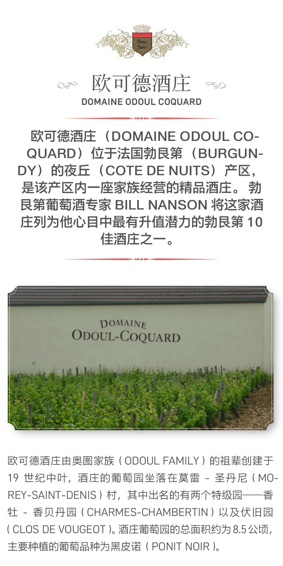欧可德酒庄(Domaine Odoul Coquard)位于法国勃艮第(Burgundy)的夜丘(Cote de Nuits)产区,是该产区内一座家族经营的精品酒庄。勃艮第葡萄酒专家Bill Nanson将这家酒庄列为他心目中最有升值潜力的勃艮第10佳酒庄之一。