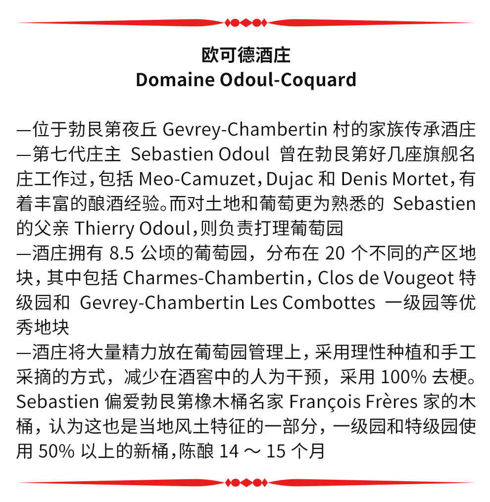 欧可德酒庄由奥图家族(Odoul Family)的祖辈创建于19世纪中叶,酒庄的葡萄园坐落在莫雷-圣丹尼(Morey-Saint-Denis)村,其中出名的有两个特级园——香牡-香贝丹园(Charmes-Chambertin)以及伏旧园(Clos de Vougeot)。酒庄葡萄园的总面积约为8.5公顷,主要种植的葡萄品种为黑皮诺(Ponit Noir)。